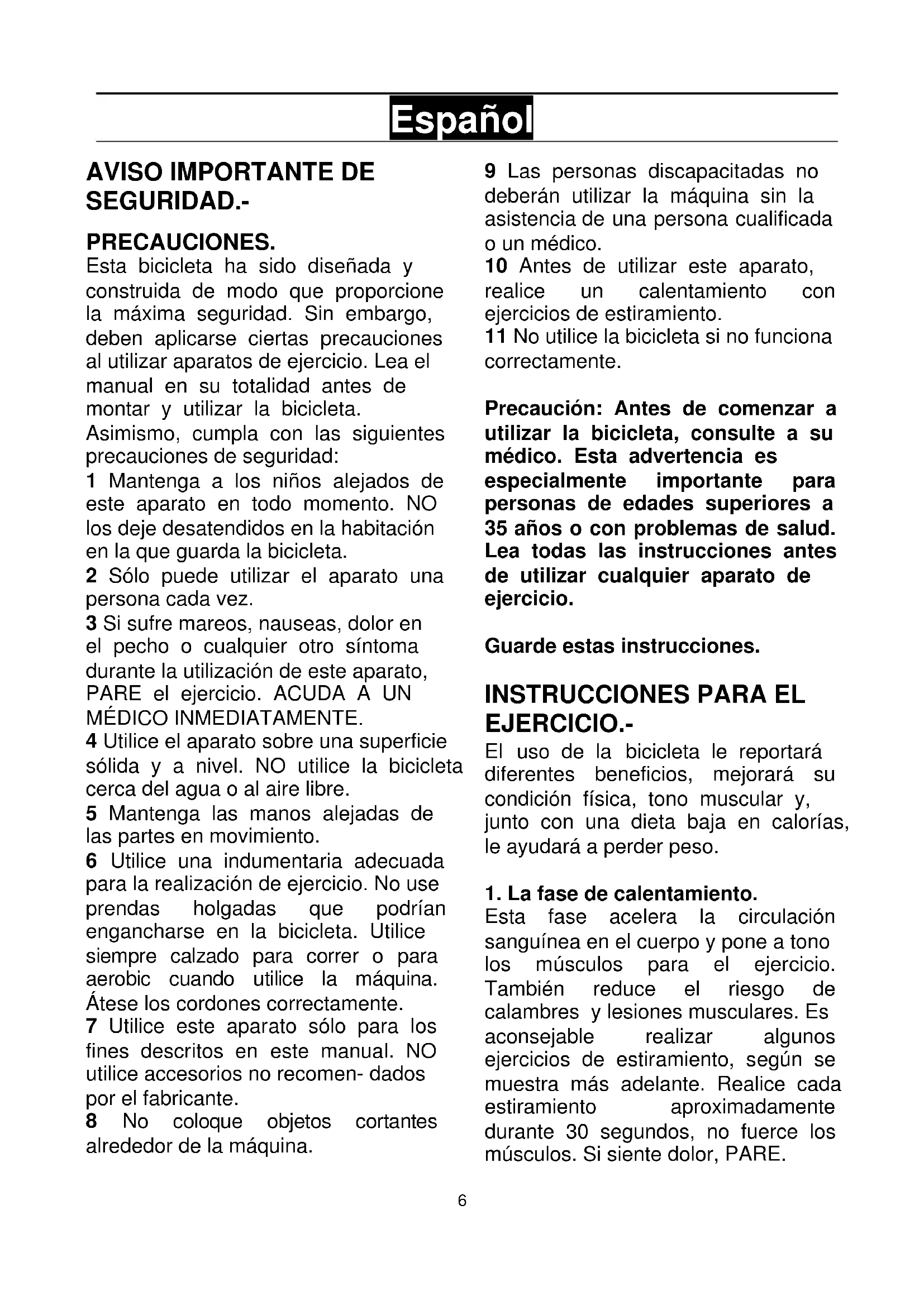 SEGURIDAD.- PRECAUCIONES. Esta bicicleta ha sido diseñada y construida de modo que proporcione la máxima seguridad. Sin embargo, deben aplicarse ciertas precauciones al utilizar aparatos de ejercicio. Lea el manual en su totalidad antes de montar y utilizar la bicicleta. Asimismo, cumpla con las siguientes precauciones de seguridad: 1 Mantenga a los niños alejados de este aparato en todo momento. NO los deje desatendidos en la habitación en la que guarda la bicicleta. 2 Sólo puede utilizar el aparato una persona cada vez. 3 Si sufre mareos, nauseas, dolor en el pecho o cualquier otro síntoma durante la utilización de este aparato, PARE el ejercicio. ACUDA A UN MÉDICO INMEDIATAMENTE. 4 Utilice el aparato sobre una superficie sólida y a nivel. NO utilice la bicicleta cerca del agua o al aire libre. 5 Mantenga las manos alejadas de las partes en movimiento. 6 Utilice una indumentaria adecuada para la realización de ejercicio. No use prendas holgadas que podrían engancharse en la bicicleta. Utilice siempre calzado para correr o para aerobic cuando utilice la máquina. Átese los cordones correctamente. 7 Utilice este aparato sólo para los fines descritos en este manual. NO utilice accesorios no recomen- dados por el fabricante. 8 No coloque objetos cortantes alrededor de la máquina. 9 Las personas discapacitadas no deberán utilizar la máquina sin la asistencia de una persona cualificada o un médico. 10 Antes de utilizar este aparato, realice un calentamiento con ejercicios de estiramiento. 11 No utilice la bicicleta si no funciona correctamente. Precaución: Antes de comenzar a utilizar la bicicleta, consulte a su médico. Esta advertencia es especialmente importante para personas de edades superiores a 35 años o con problemas de salud. Lea todas las instrucciones antes de utilizar cualquier aparato de ejercicio. Guarde estas instrucciones.