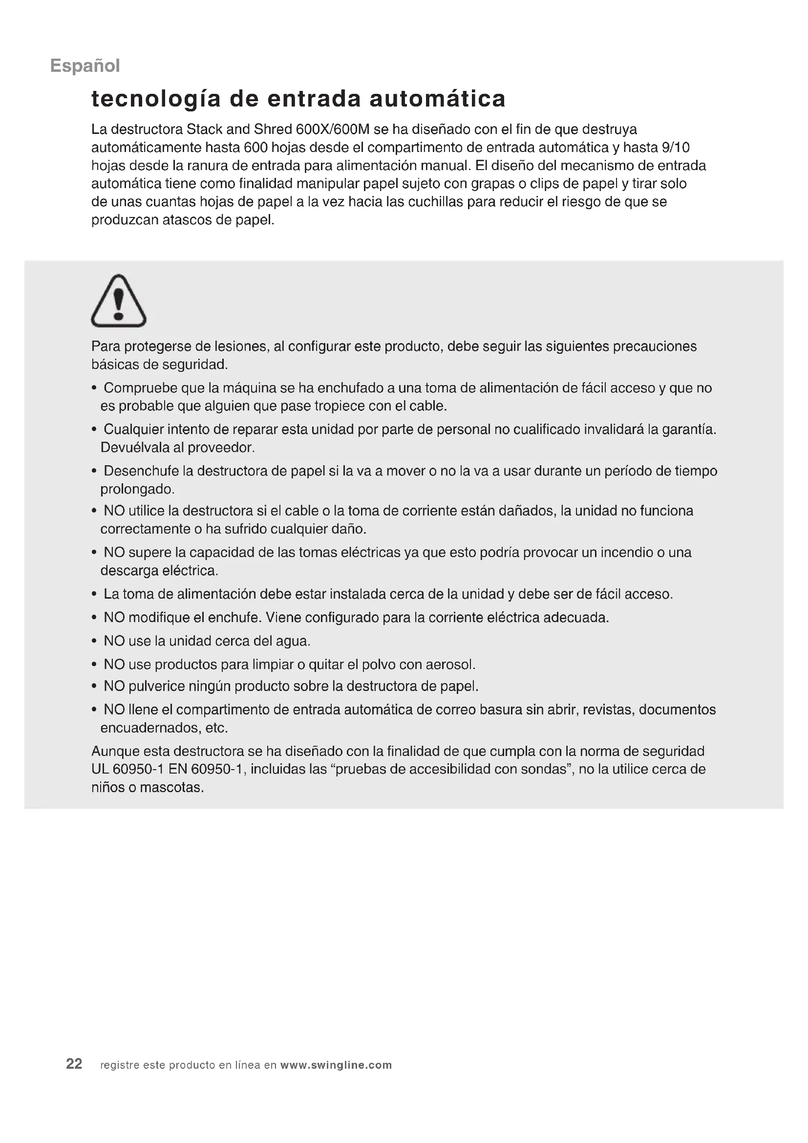 - ACCO Brands no acepta responsabilidad alguna sobre el rendimiento del producto ni su seguridad si se aplican otros tipos o marcas de lubricante en alguna de las piezas de esta máquina. Español limpieza automática de las cuchillas Una vez que se haya vaciado y vuelto a colocar el recipiente, la destructora funcionará en modo retroceso durante 4 segundos, se detendrá durante 2 segundos y funcionará en modo de avance durante 4 segundos para eliminar los restos de papel de las cuchillas. Este mecanismo de “limpieza automática” exclusivo se añade a la tecnología antiatascos de Swingline. lubricación de la trituradora Utilice únicamente hojas lubricantes para lubricar. ACCO Brands no acepta ninguna responsabilidad por la seguridad o el rendimiento del producto cuando se utilizan otros tipos de lubricantes para cualquier pieza de esta máquina. Inserte la hoja lubricante en la ranura de alimentación manual, y NO en la cámara de alimentación automática. El uso de una hoja lubricante en la cámara de alimentación automática contaminará los rodillos de alimentación, lo que impedirá que el mecanismo de alimentación automática triture. Siga las instrucciones de mantenimiento, si los rodillos se contaminan. No haga directamente del aceite la desbradora.26 registre este producto en línea en www.swingline.com