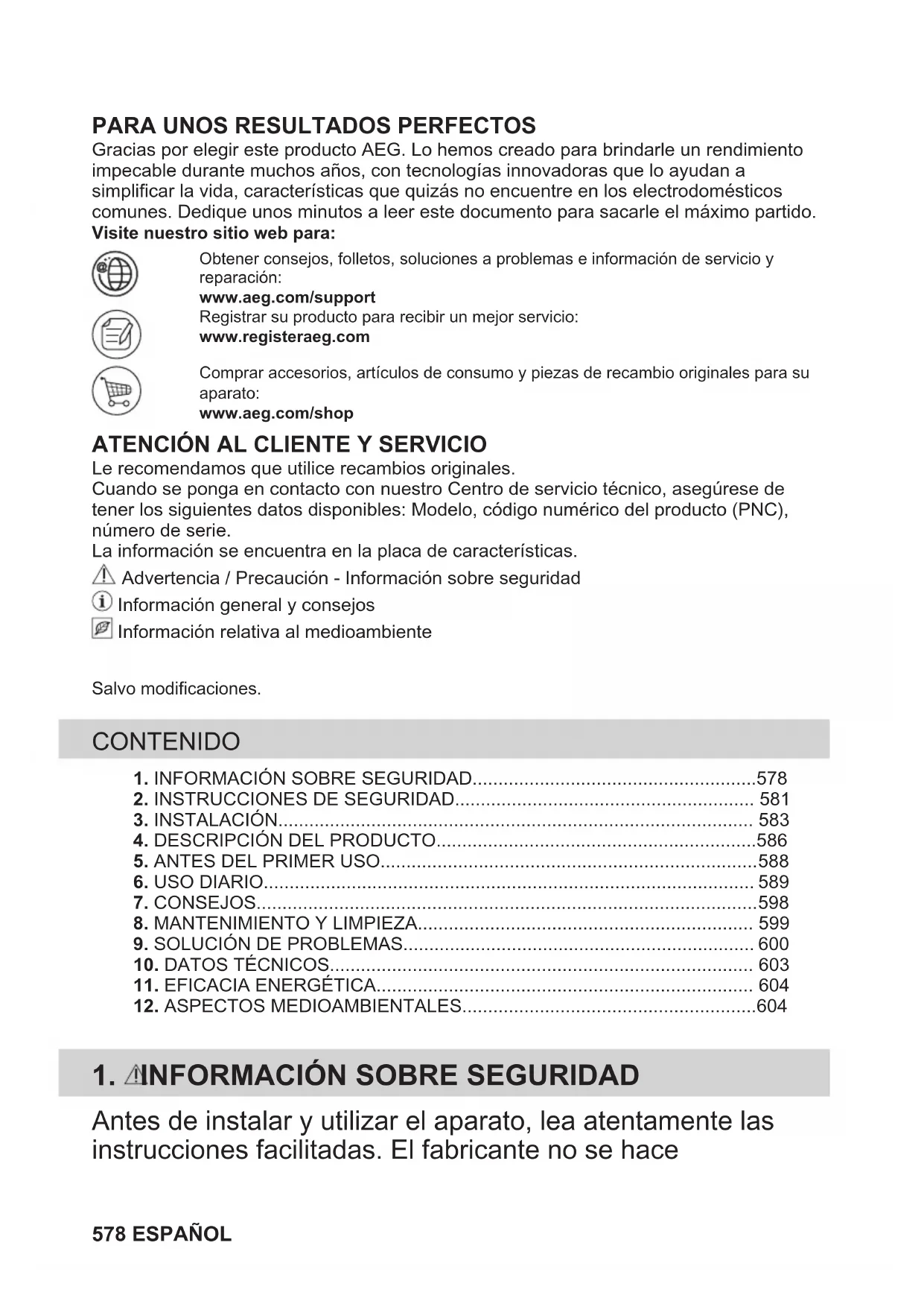 Le recomendamos que utilice recambios originales.Cuando se ponga en contacto con nuestro Centro de servicio técnico, asegúrese detener los siguientes datos disponibles: Modelo, código numérico del producto (PNC),número de serie.La información se encuentra en la placa de características. Advertencia / Precaución - Información sobre seguridad Información general y consejos Información relativa al medioambienteSalvo modificaciones. CONTENIDO 1. INFORMACIÓN SOBRE SEGURIDAD.......................................................5782. INSTRUCCIONES DE SEGURIDAD.......................................................... 581