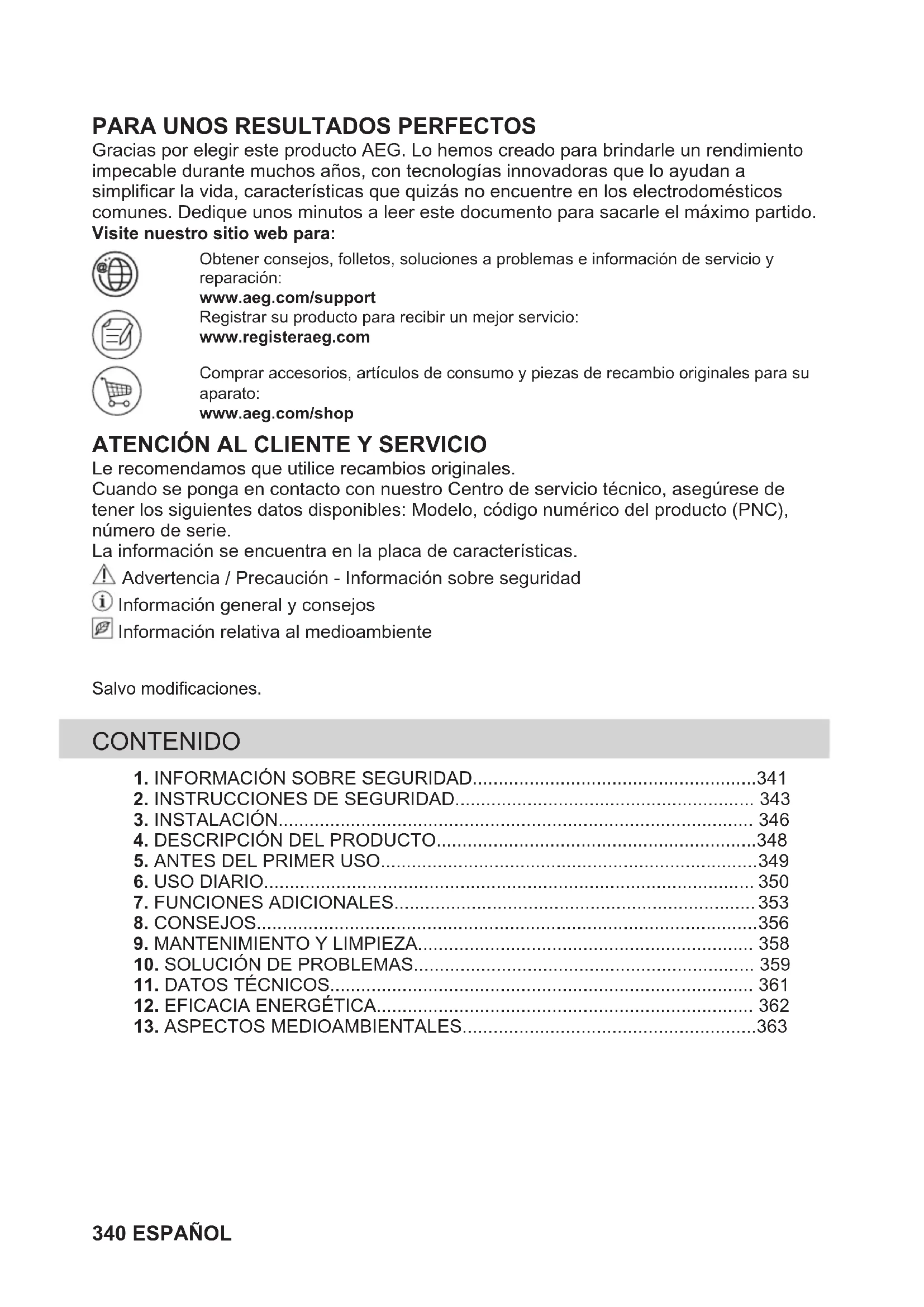 Gracias por elegir este producto AEG. Lo hemos creado para brindarle un rendimiento impecable durante muchos años, con tecnologías innovadoras que lo ayudan a simplificar la vida, características que quizás no encuentre en los electrodomésticos comunes. Dedique unos minutos a leer este documento para sacarle el máximo partido. Visite nuestro sitio web para: Obtener consejos, folletos, soluciones a problemas e información de servicio yreparación:www.aeg.com/supportRegistrar su producto para recibir un mejor servicio:www.registeraeg.comComprar accesorios, artículos de consumo y piezas de recambio originales para suaparato:www.aeg.com/shop