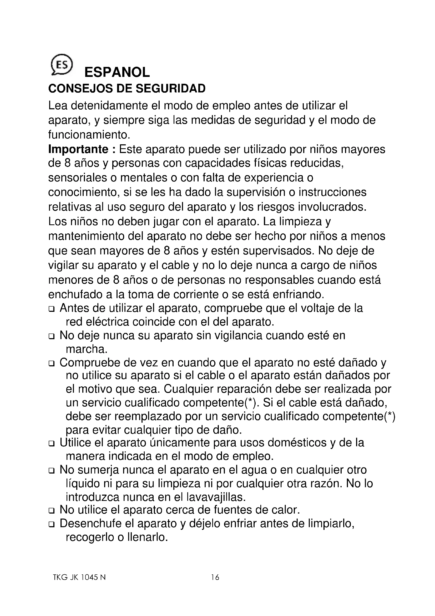 ❑ Procure no utilizar el aparato en el exterior y colóquelo en un sitio seco. ❑ No utilice accesorios no recomendados por el fabricante, ello puede conllevar un riesgo para el usuario y dañar el aparato. ❑ No mueva nunca el aparato estirando del cable. Procure que el cable no se enganche en alguna parte, a fin de evitar posibles caídas del mismo. Evite enrollar el cable alrededor del aparato y no lo tuerza. ❑ Coloque el aparato sobre una mesa o un soporte estable para evitar su caída. ❑ Si su hervidor cuenta con una base separada o con un cable de alimentación amovible, procure separarlos del hervidor cuando lo llene. Si su hervidor tiene un cable fijo, desenchúfelo antes de proceder al llenado. ❑ Al llenar el hervidor con agua, respete los niveles mínimo y máximo indicados. Compruebe siempre que el nivel del agua no esté por debajo del mínimo para evitar daños al elemento calefactor y que no sobrepase el nivel máximo ya que si su hervidor está demasiado lleno, podría salpicar agua hirviente. ❑ Procure que durante el funcionamiento la tapa esté correctamente cerrada. No abra la tapa hasta que el hervidor esté del todo apagado y que no haya riesgo de salpicaduras. ❑ Cuidado: no se queme con el vapor que sale durante la ebullición especialmente por la tapa. ❑ Su hervidor debe ser utilizado únicamente con la base original. ❑ Cuando el símbolo se encuentra en una superficie especifica. Recuerda que tiene que tener mucho cuidado e significa: “¡CUIDADO! Esta superficie puede volverse muy caliente durante el uso”. (*) Servicio técnico cualificado: servicio técnico del fabricante o del importador o una persona cualificada, reconocida y habilitada a fin de evitar cualquier peligro. En cualquier caso devuelva el aparato al servicio técnico.TKG JK 1045 N