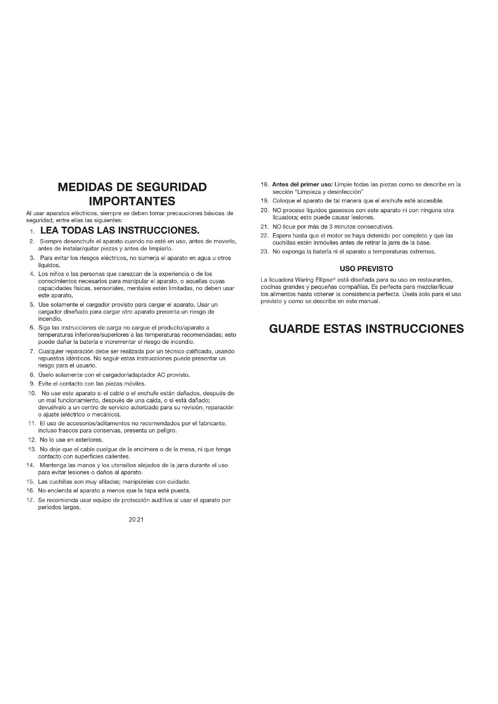 contra defectos de materiales y mano de obra durante un periodo de tres años (motor) y un año (materiales y mano de obra). Esta garantía cubre todos los defectos de fabricación, siempre que el aparato haya sido usado solamente con productos alimenticios, líquidos no abrasivos (incluyendo detergentes) y productos semilíquidos no abrasivos, y que no haya sido sometido a cargas superiores al valor nominal indicado. Esta garantía se aplica solamente al usuario final original y no es transferible. Para beneficiarse de esta garantía, es necesario presentar un justificante de compra. Cualquier garantía ofrecida por Waring es válida solamente si el producto se usa de acuerdo con el manual de instrucciones (también disponible en www.waring.com) y con todas las instrucciones de mantenimiento, independientemente de la fecha en que se hayan suministrado. La garantía entra en vigor en la fecha de compra, indicada en el justificante de compra. Bajo esta garantía, Waring reparará o sustituirá, a su entera discreción y durante el periodo de garantía, cualquier pieza que consideremos defectuosa en materiales o mano de obra, siempre que el producto se entregue con franqueo pagado a un centro de servicio autorizado. La lista de centros de servicio autorizados está disponible en https://www.waringcommercialproducts.com/support/service. Advertencia: Esta garantía no es válida: 1) Si el aparato es usado con corriente continua (CC/DC). C); b) Si cualquier pieza cubierta por la garantía ha sido modificada, alterada, reacondicionada o reparada por personas que no sean Waring, un centro de servicio autorizado por Waring o un distribuidor autorizado por Waring; c) Si piezas Waring cubiertas por esta garantía se han usado junto con otras piezas sin la autorización expresa por escrito de Waring; o d) Si cualquier pieza del aparato ha sido instalada incorrectamente, incluyendo, sin limitación a, debido a mano de obra inadecuada y el incumplimiento de las especificaciones proporcionadas. La única obligación de Waring bajo esta garantía es reparar o sustituir la(s) pieza(s) en garantía, según determine exclusivamente Waring. WARING NO SERÁ RESPONSABLE EN NINGÚN CASO DE DAÑOS ESPECIALES, INDIRECTOS, ACCIDENTALES O CONSECUENCIALES, INCLUYENDO, SIN LIMITACIÓN, LA PÉRDIDA DE BENEFICIOS O INGRESOS, YA SE BASEN EN CONTRATO, INDEMNIZACIÓN, GARANTÍA, AGRAVIO (INCLUYENDO NEGLIGENCIA), RESPONSABILIDAD ESTRICTA O CUALQUIER OTRO MOTIVO. LA ANTERIOR GARANTÍA LIMITADA ES SU RECURSO EXCLUSIVO, Y USTED Y WARING RENUNCIAN EXPRESAMENTE A CUALQUIER OTRA GARANTÍA O CONDICIÓN, EXPRESA O IMPLÍCITA, LEGAL O DE OTRO TIPO, INCLUYENDO, SIN LIMITACIÓN, CUALQUIER GARANTÍA IMPLÍCITA DE COMERCIABILIDAD E IDONEIDAD PARA UN FIN DETERMINADO PARA UN FIN DETERMINADO. USTED Y WARING EXCLUYEN POR LA PRESENTE, EN LA MÁXIMA MEDIDA PERMITIDA POR LA LEY, LA APLICACIÓN DE CUALQUIER LEY RELATIVA A LA VENTA DE BIENES Y LA CONVENCIÓN DE LAS NACIONES UNIDAS SOBRE LOS CONTRATOS DE COMPRAVENTA INTERNACIONAL DE MERCADERÍAS, CUANDO CORRESPONDA. Algunas jurisdicciones no permiten limitaciones en las garantías implícitas o en la responsabilidad por daños especiales, incidentales o consecuentes. EXCLUSIONES (DAÑOS NO CUBIERTOS POR LA GARANTÍA) : Esta garantía no cubre los daños estéticos que no afecten al funcionamiento del aparato, como la decoloración o los efectos del lavado en lavavajillas o del uso de productos abrasivos o limpiadores; las manchas; los residuos; los daños resultantes del mantenimiento, de la limpieza (incluso de acuerdo con las instrucciones contenidas en el manual de instrucciones), de los ajustes o de la instalación de repuestos; los daños incidentales o consecuentes de cualquier naturaleza relacionados con, pero no limitados a: A. El desgaste normal38 39 IMPORTANTES CONSIGNES