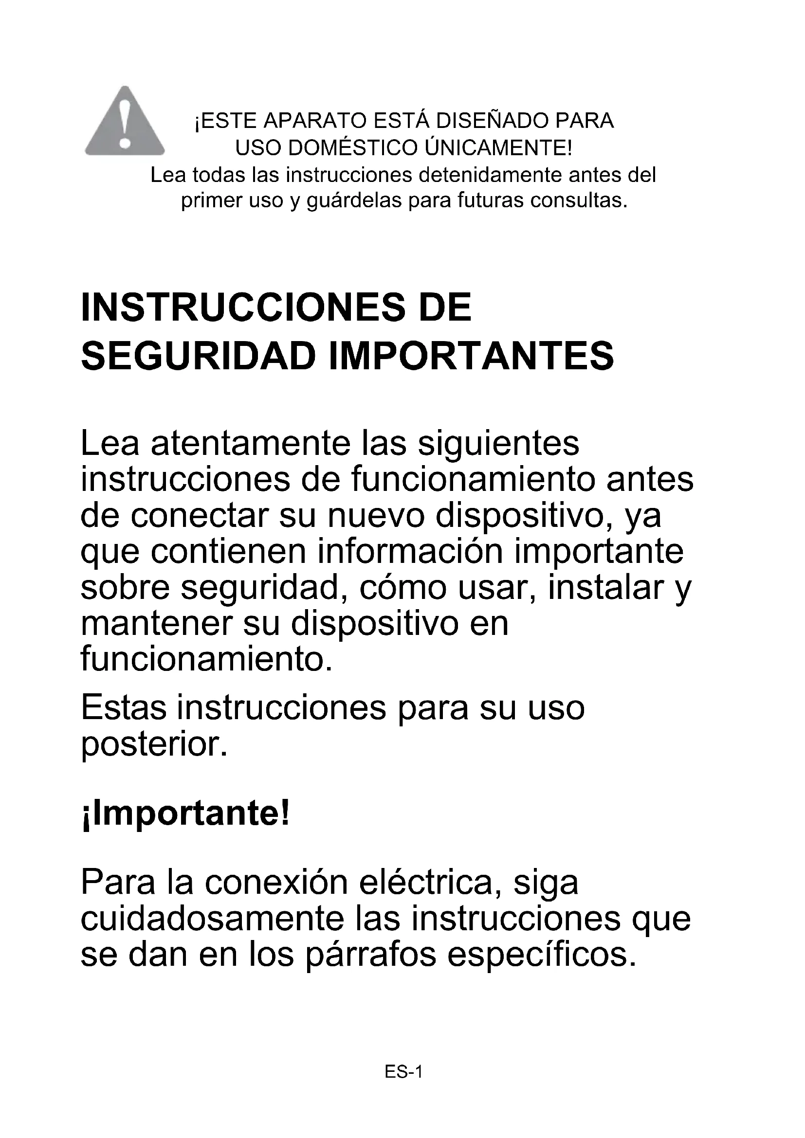 USO DOMÉSTICO ÚNICAMENTE! Lea todas las instrucciones detenidamente antes del primer uso y guárdelas para futuras consultas. INSTRUCCIONES DE SEGURIDAD IMPORTANTES Lea atentamente las siguientes instrucciones de funcionamiento antes de conectar su nuevo dispositivo, ya que contienen información importante sobre seguridad, cómo usar, instalar y mantener su dispositivo en funcionamiento. Estas instrucciones para su uso posterior. ¡Importante! Para la conexión eléctrica, siga cuidadosamente las instrucciones que se dan en los párrafos específicos.ES-2 1.Este dispositivo puede ser utilizado por niños a partir de 8 años y por personas con capacidades físicas, sensoriales o mentales reducidas o con falta de experiencia y conocimientos, siempre que hayan sido puestos bajo supervisión o hayan recibido instrucciones sobre cómo utilizar el dispositivo de forma segura y que ellos comprenden los peligros involucrados. Los niños no deben jugar con el dispositivo. Los niños no deben realizar la limpieza y el mantenimiento del usuario sin supervisión.