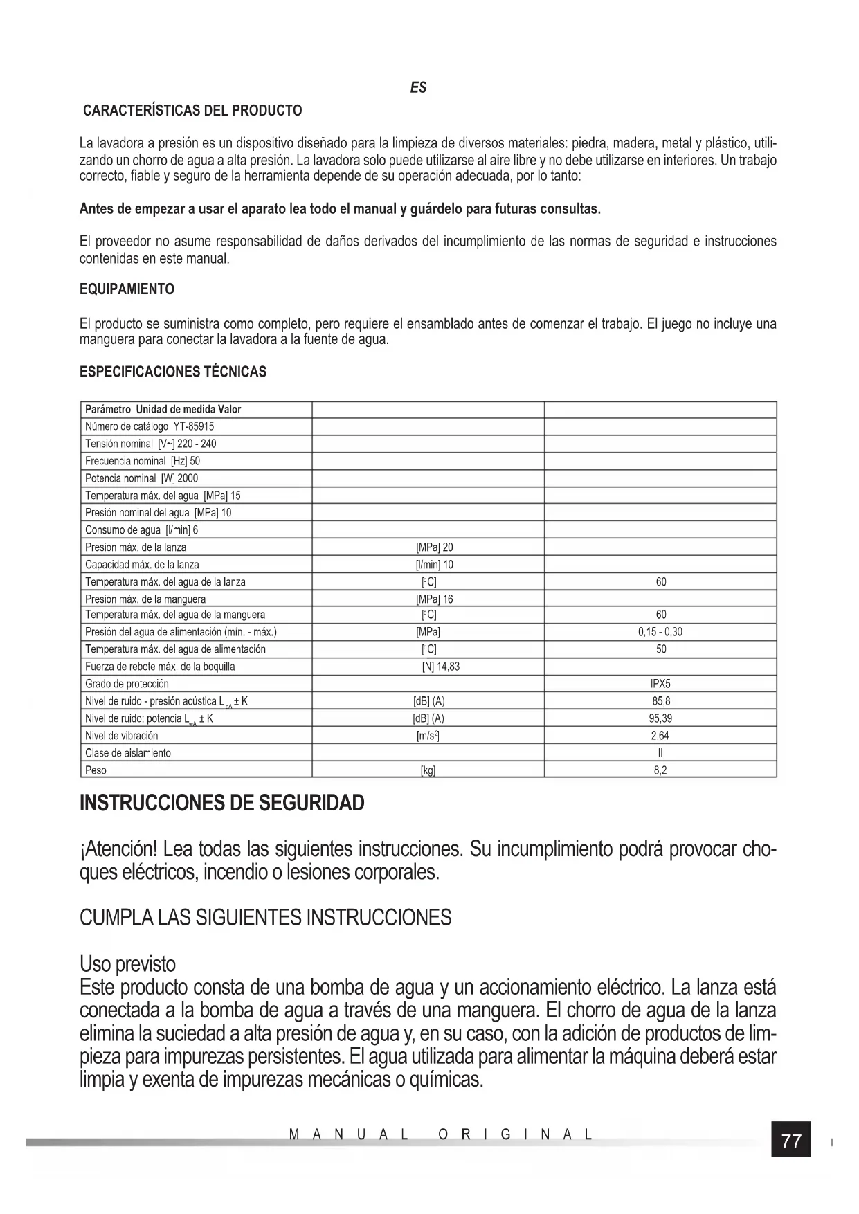 Parámetro Unidad de medida Valor Número de catálogo YT-85915 Tensión nominal [V~] 220 - 240 Frecuencia nominal [Hz] 50 Potencia nominal [W] 2000 Temperatura máx. del agua [MPa] 15 Presión nominal del agua [MPa] 10 Consumo de agua [l/min] 6 Presión máx. de la lanza [MPa] 20 Capacidad máx. de la lanza [l/min] 10 Temperatura máx. del agua de la lanza [