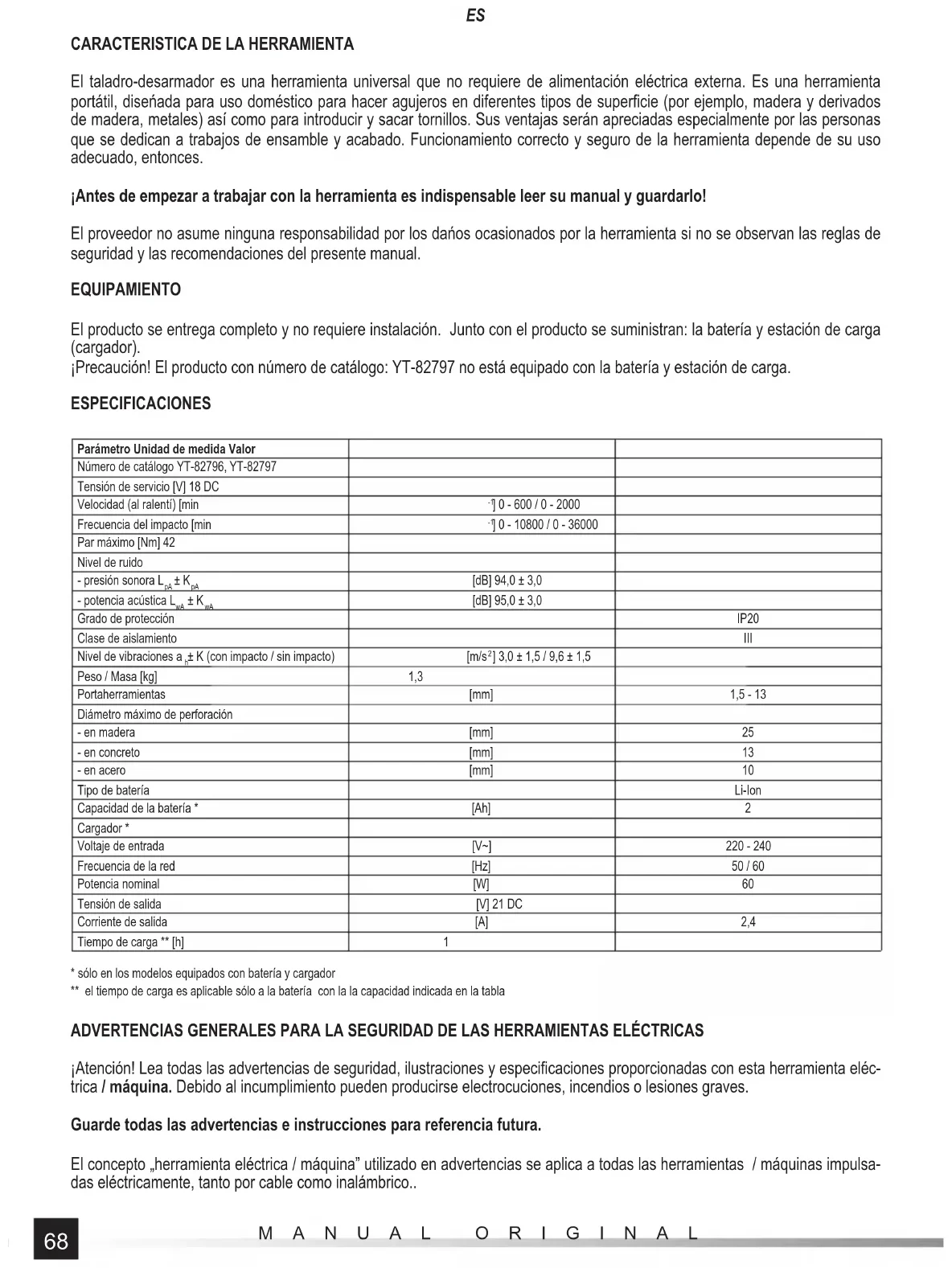 El taladro-desarmador es una herramienta universal que no requiere de alimentación eléctrica externa. Es una herramienta portátil, diseńada para uso doméstico para hacer agujeros en diferentes tipos de superfi cie (por ejemplo, madera y derivados de madera, metales) así como para introducir y sacar tornillos. Sus ventajas serán apreciadas especialmente por las personas que se dedican a trabajos de ensamble y acabado. Funcionamiento correcto y seguro de la herramienta depende de su uso adecuado, entonces. ¡Antes de empezar a trabajar con la herramienta es indispensable leer su manual y guardarlo! El proveedor no asume ninguna responsabilidad por los dańos ocasionados por la herramienta si no se observan las reglas de seguridad y las recomendaciones del presente manual. EQUIPAMIENTO El producto se entrega completo y no requiere instalación. Junto con el producto se suministran: la batería y estación de carga (cargador). ¡Precaución! El producto con número de catálogo: YT-82797 no está equipado con la batería y estación de carga. ESPECIFICACIONES Parámetro Unidad de medida Valor Número de catálogo YT-82796, YT-82797 Tensión de servicio [V] 18 DC Velocidad (al ralentí) [min