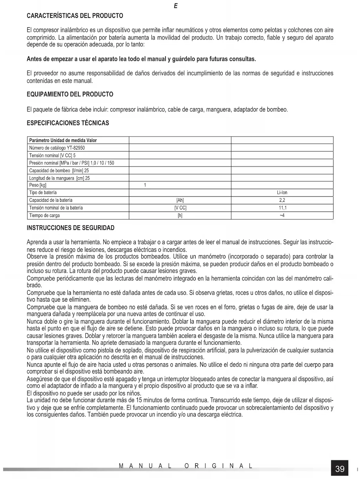 Aprenda a usar la herramienta. No empiece a trabajar o a cargar antes de leer el manual de instrucciones. Seguir las instruccio- nes reduce el riesgo de lesiones, descargas eléctricas o incendios. Observe la presión máxima de los productos bombeados. Utilice un manómetro (incorporado o separado) para controlar la presión dentro del producto bombeado. Si se excede la presión máxima, se pueden producir daños en el producto bombeado o incluso su rotura. La rotura del producto puede causar lesiones graves. Compruebe periódicamente que las lecturas del manómetro integrado en la herramienta coincidan con las del manómetro cali- brado. Compruebe que la herramienta no esté dañada antes de cada uso. Si observa grietas, roces u otros daños, no utilice el disposi- tivo hasta que se eliminen. Compruebe que la manguera de bombeo no esté dañada. Si se ven roces en el forro, grietas o fugas de aire, deje de usar la manguera dañada y reemplácela por una nueva antes de continuar el uso. Nunca doble o gire la manguera durante el funcionamiento. Doblar la manguera puede reducir el diámetro interior de la misma hasta el punto en que el fl ujo de aire se detiene. Esto puede provocar daños en la manguera o incluso su rotura, lo que puede causar lesiones graves. Doblar y retorcer la manguera también acelera el desgaste de la misma. Nunca utilice la manguera para transportar la herramienta. No apriete demasiado la manguera durante el funcionamiento. No utilice el dispositivo como pistola de soplado, dispositivo de respiración artifi cial, para la pulverización de cualquier sustancia o para cualquier otra aplicación no descrita en el manual de instrucciones. Nunca apunte el fl ujo de aire hacia usted u otras personas o animales. No utilice el dedo ni ninguna otra parte del cuerpo para comprobar si el dispositivo está bombeando aire. Asegúrese de que el dispositivo esté apagado y tenga un interruptor bloqueado antes de conectar la manguera al dispositivo, así como el adaptador de infl ado a la manguera y el propio dispositivo al producto que se va a infl ar. El dispositivo no puede ser usado por los niños. La unidad no debe funcionar durante más de 15 minutos de forma continua. Transcurrido este tiempo, deje de utilizar el disposi- tivo y deje que se enfríe completamente. El funcionamiento continuado puede provocar un sobrecalentamiento del dispositivo y los consiguientes daños. También puede provocar un incendio y/o una descarga eléctrica.40 MANUAL ORIGINAL