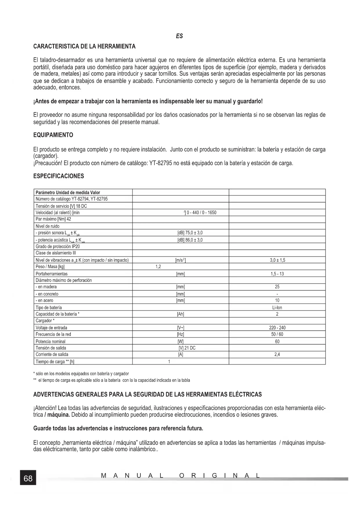 - sólo en los modelos equipados con batería y cargador ** el tiempo de carga es aplicable sólo a la batería con la la capacidad indicada en la tabla ADVERTENCIAS GENERALES PARA LA SEGURIDAD DE LAS HERRAMIENTAS ELÉCTRICAS ¡Atención! Lea todas las advertencias de seguridad, ilustraciones y especifi caciones proporcionadas con esta herramienta eléc- trica / máquina. Debido al incumplimiento pueden producirse electrocuciones, incendios o lesiones graves. Guarde todas las advertencias e instrucciones para referencia futura. El concepto „herramienta eléctrica / máquina” utilizado en advertencias se aplica a todas las herramientas / máquinas impulsa- das eléctricamente, tanto por cable como inalámbrico..69 MANUAL ORIGINAL