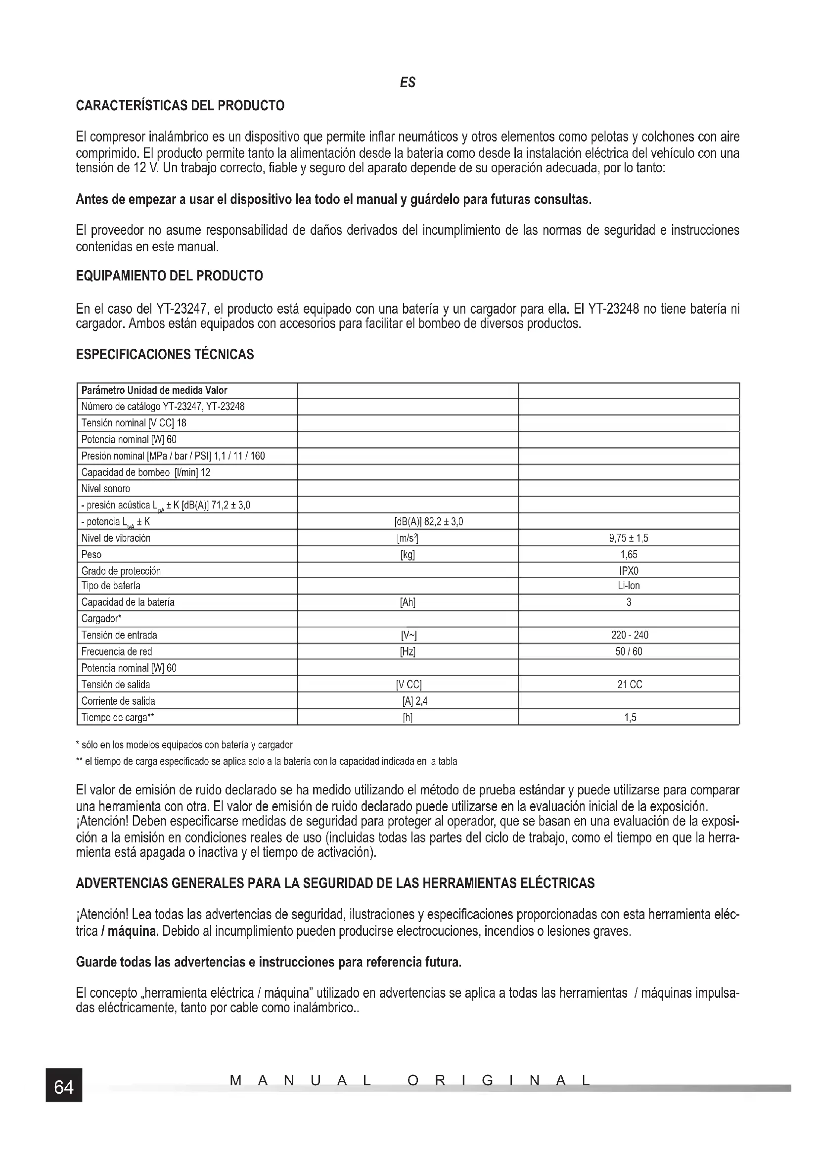 - sólo en los modelos equipados con batería y cargador ** el tiempo de carga especifi cado se aplica solo a la batería con la capacidad indicada en la tabla El valor de emisión de ruido declarado se ha medido utilizando el método de prueba estándar y puede utilizarse para comparar una herramienta con otra. El valor de emisión de ruido declarado puede utilizarse en la evaluación inicial de la exposición. ¡Atención! Deben especifi carse medidas de seguridad para proteger al operador, que se basan en una evaluación de la exposi- ción a la emisión en condiciones reales de uso (incluidas todas las partes del ciclo de trabajo, como el tiempo en que la herra- mienta está apagada o inactiva y el tiempo de activación). ADVERTENCIAS GENERALES PARA LA SEGURIDAD DE LAS HERRAMIENTAS ELÉCTRICAS ¡Atención! Lea todas las advertencias de seguridad, ilustraciones y especifi caciones proporcionadas con esta herramienta eléc- trica / máquina. Debido al incumplimiento pueden producirse electrocuciones, incendios o lesiones graves. Guarde todas las advertencias e instrucciones para referencia futura. El concepto „herramienta eléctrica / máquina” utilizado en advertencias se aplica a todas las herramientas / máquinas impulsa- das eléctricamente, tanto por cable como inalámbrico..65 MANUAL ORIGINAL