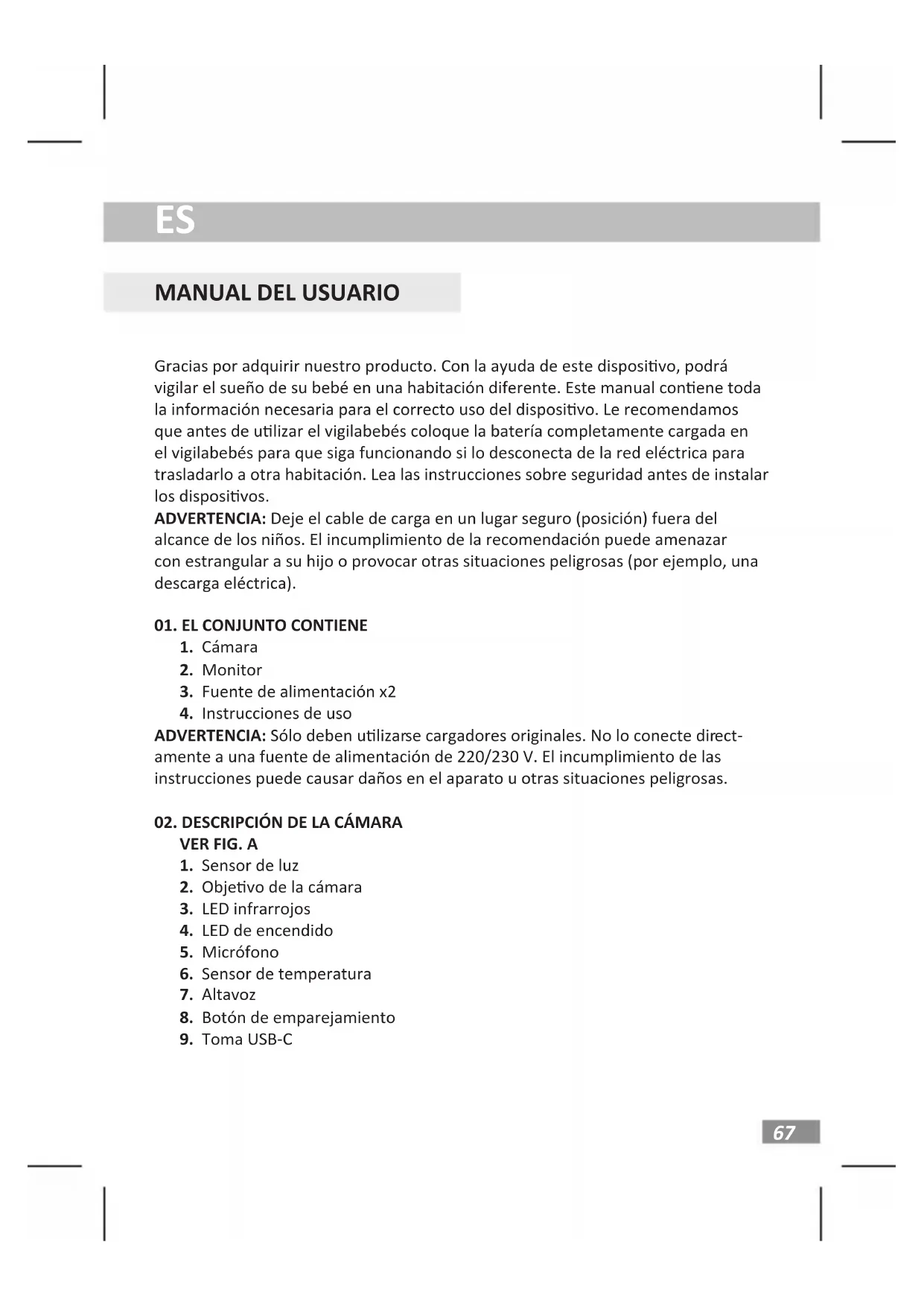 Gracias por adquirir nuestro producto. Con la ayuda de este disposivo, podrá vigilar el sueño de su bebé en una habitación diferente. Este manual conene toda la información necesaria para el correcto uso del disposivo. Le recomendamos que antes de ulizar el vigilabebés coloque la batería completamente cargada en el vigilabebés para que siga funcionando si lo desconecta de la red eléctrica para trasladarlo a otra habitación. Lea las instrucciones sobre seguridad antes de instalar los disposivos. ADVERTENCIA: Deje el cable de carga en un lugar seguro (posición) fuera del alcance de los niños. El incumplimiento de la recomendación puede amenazar con estrangular a su hijo o provocar otras situaciones peligrosas (por ejemplo, una descarga eléctrica).