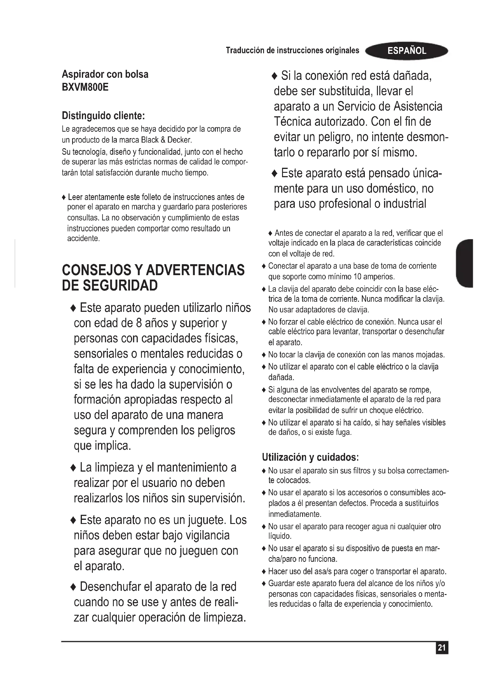 Aspirador con bolsa BXVM800E Distinguido cliente: Le agradecemos que se haya decidido por la compra de un producto de la marca Black & Decker. Su tecnología, diseño y funcionalidad, junto con el hecho de superar las más estrictas normas de calidad le compor- tarán total satisfacción durante mucho tiempo. ♦ Leer atentamente este folleto de instrucciones antes de poner el aparato en marcha y guardarlo para posteriores consultas. La no observación y cumplimiento de estas instrucciones pueden comportar como resultado un accidente.