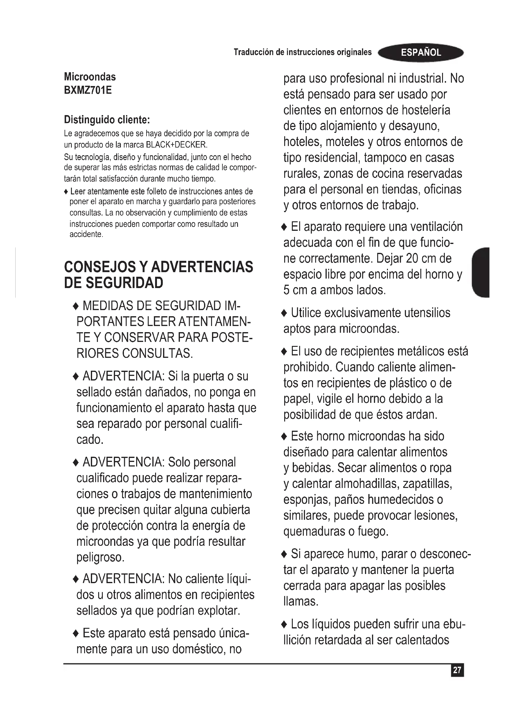 Microondas BXMZ701E Distinguido cliente: Le agradecemos que se haya decidido por la compra de un producto de la marca BLACK+DECKER. Su tecnología, diseño y funcionalidad, junto con el hecho de superar las más estrictas normas de calidad le compor- tarán total satisfacción durante mucho tiempo. ♦ Leer atentamente este folleto de instrucciones antes de poner el aparato en marcha y guardarlo para posteriores consultas. La no observación y cumplimiento de estas instrucciones pueden comportar como resultado un accidente.