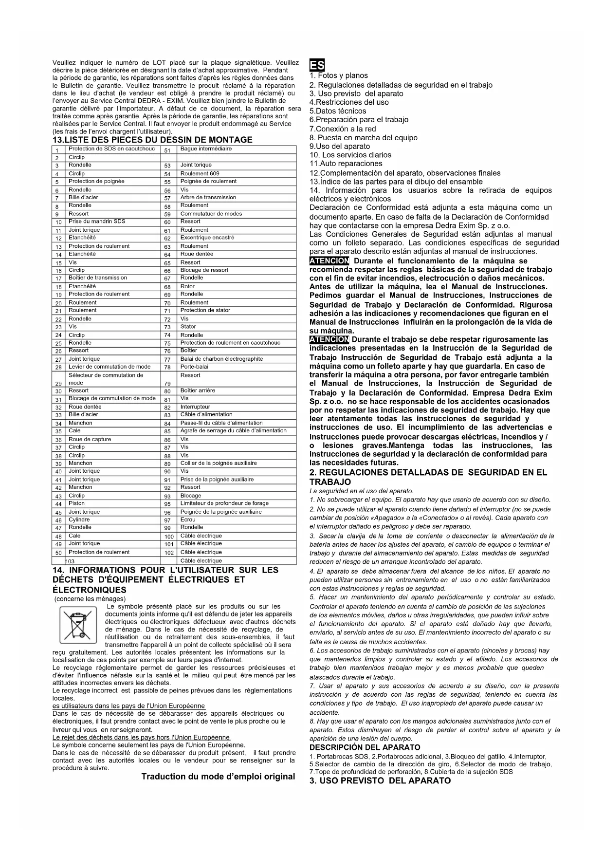 FINALES Equipamiento:1.Martillo percutor- rotatorio2.Empuñadura adicional3.Tope de profundidad de perforación4.Adaptador SDS - portabrocas,5.Llave para portabrocas6.Brocas para hormigón - 3 uds.7. Grasa de repuesto Observaciones finales Cuando se realice el pedido de repuestos por favor mencionar el Número de Serie del aparato que se encuentra en la placa de fabricación. Por favor, describir la pieza defectuosa, indicando además la fecha aproximada de compra. Durante el periodo de garantía las reparaciones se hacen en base de las condiciones descritas en la Carta de Garantía. La pieza de reclamo, por favor entregarla al servicio en el lugar donde se la compro (el vendedor está obligado a recibir la pieza de reclamo), o enviarla al Servicio Central DEDRA - EXIM. Pedimos adjuntar la Carta de Garantía emitida por el Importador. Sin este documento el arreglo será tratado como el servicio fuera de garantía. Después del periodo de garantía los arreglos se realizan en el Servicio Central. El producto dañado hay que enviarlo al Servicio (el costo de envío cubre el usuario).