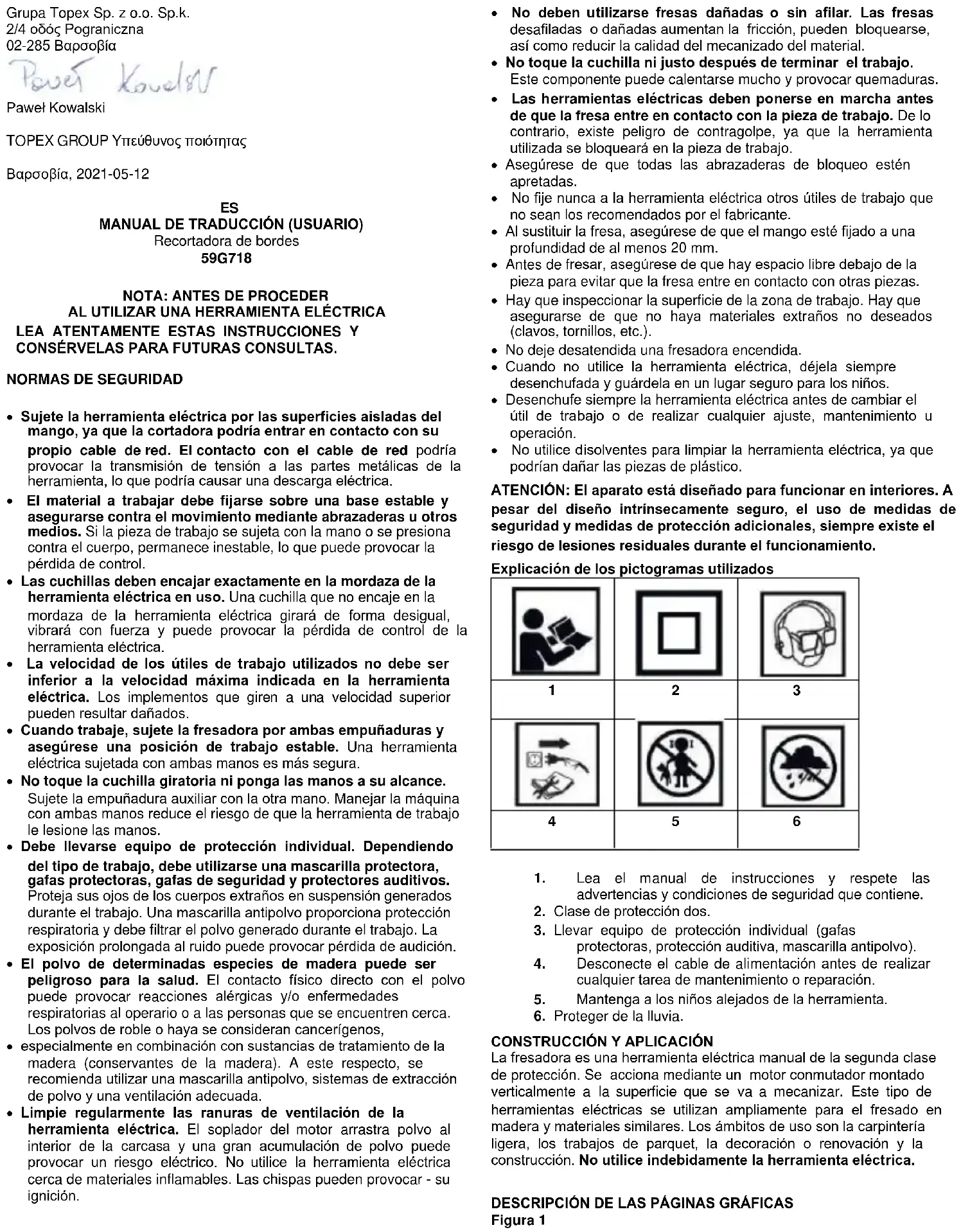 - Los productos accionados eléctricamente no deben desecharse con la basura doméstica, sino que deben llevarse a instalaciones adecuadas para su eliminación. Póngase en contacto con el distribuidor del producto o con las autoridades locales para obtener información sobre su eliminación. Los residuos de aparatos eléctricos y electrónicos contienen sustancias nocivas para el medio ambiente. Los aparatos que no se reciclan suponen un riesgo potencial para el medio ambiente y la salud humana. "Grupa Topex Spółka z ograniczoną odpowiedzialnością". Spółka komandytowa con domicilio social en Varsovia, ul. Pograniczna 2/4 (en adelante: "Grupa Topex") informa que todos los derechos de autor del contenido de este manual (en adelante: "Manual"), incluyendo, entre otros. Su texto, fotografías, diagramas, dibujos, así como su composición, pertenecen exclusivamente a Grupa Topex y están sujetos a protección legal en virtud de la Ley de 4 de febrero de 1994 sobre Derechos de Autor y Derechos Conexos (Diario de Leyes 2006 Nº 90 Poz. 631, en su versión modificada). La copia, el procesamiento, la publicación, la modificación con fines comerciales de todo el Manual y de sus elementos individuales, sin el consentimiento de Grupa Topex expresado por escrito, están estrictamente prohibidos y pueden dar lugar a responsabilidades civiles y penales. Declaración de conformidad CE Fabricante: Grupa Topex Sp. z o.o. Sp.k., Pograniczna 2/4 02-285 Warszawa Producto: Fresadora de cantos Modelo: 59G718 Nombre comercial: GRAFITO Número de serie: 00001 ÷ 99999 Esta declaración de conformidad se emite bajo la exclusiva responsabilidad del fabricante. El producto descrito anteriormente cumple con los siguientes documentos: Directiva sobre máquinas 2006/42/CE Directiva de compatibilidad electromagnética 2014/30/UE Directiva RUSP 2011/65/UE modificada por la Directiva 2015/863/UE Y cumple los requisitos de las normas: EN 62841-1:2015+AC:15; EN 62841-2-17:2017; EN 55014-1:2017+A11:2020; EN 55014-2:2015; EN IEC 61000-3- 2:2019; EN 61000-3-3:2013+A1:2019; CEI 62321-3-1:2013; CEI 62321-4:2013+AMD1:2017; CEI 62321- 5:2013; CEI 62321-6:2015; CEI 62321-7-1:2015; CEI 62321-7-2:2017; CEI 62321-8:2017 Esta declaración se refiere únicamente a la máquina tal y como se comercializa y no incluye los componentes añadido por el usuario final o realizado por él posteriormente. Nombre y dirección de la persona residente en la UE autorizada a preparar el expediente técnico: Firmado en nombre de: Grupa Topex Sp. z o.o. Sp.k. Calle Pograniczna, 2/4 02-285 Varsovia Paweł Kowalski Responsable de Calidad del GRUPO TOPEX Varsovia, 2021-05-12