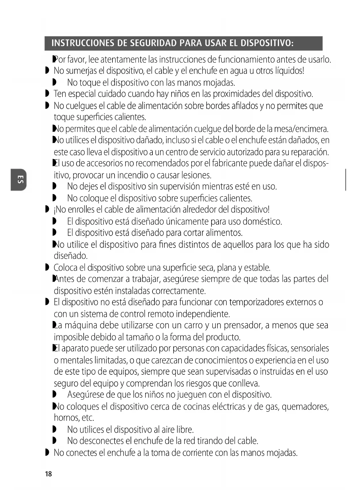 Por favor, lee atentamente las instrucciones de funcionamiento antes de usarlo. No sumerjas el dispositivo, el cable y el enchufe en agua u otros líquidos! No toque el dispositivo con las manos mojadas. Ten especial cuidado cuando hay niños en las proximidades del dispositivo. No cuelgues el cable de alimentación sobre bordes afilados y no permites que toque superficies calientes.