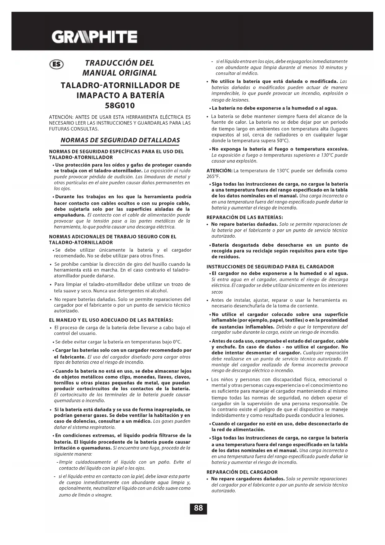 Alcance de sujeción rápida 2-13 mm Alcance de ajuste del par de giro 1–16 + perforación, perforación con impacto Torque máx. (atornillado suave) 35 Nm Torque máx. (atornillado duro) 55 Nm Clase de protección III Peso 1,3 kg Año de fabricación 2021 Cargador del sistema Graphite Energy+ Parámetro técnico Valor Batería 58G001 58G004 Tensión del cargador 18 V DC 18 V DC Tipo de batería Li-Ion Li-Ion Capacidad de la batería 2000 mAh 4000 mAh Alcance de temperatura ambiente 4
