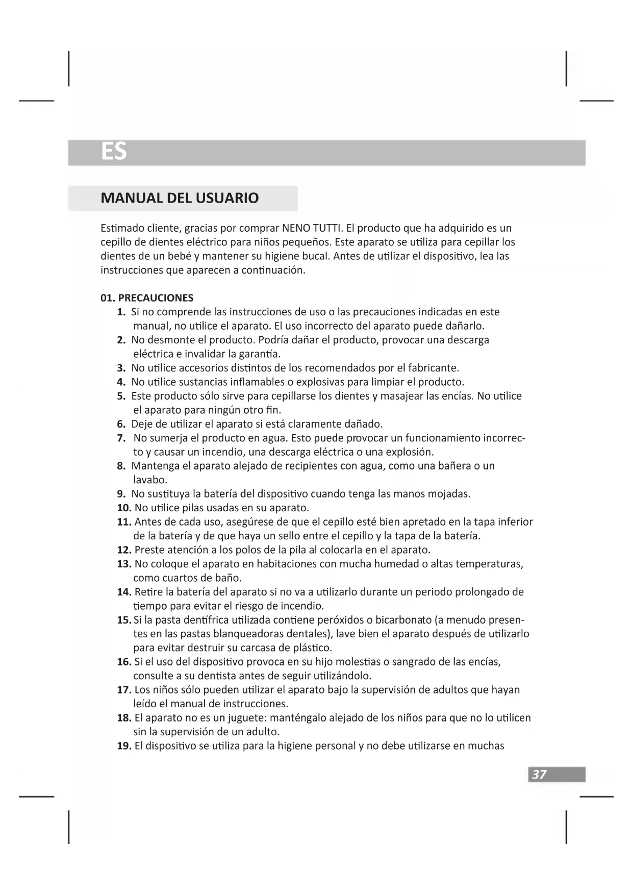Esmado cliente, gracias por comprar NENO TUTTI. El producto que ha adquirido es un cepillo de dientes eléctrico para niños pequeños. Este aparato se uliza para cepillar los dientes de un bebé y mantener su higiene bucal. Antes de ulizar el disposivo, lea las instrucciones que aparecen a connuación.