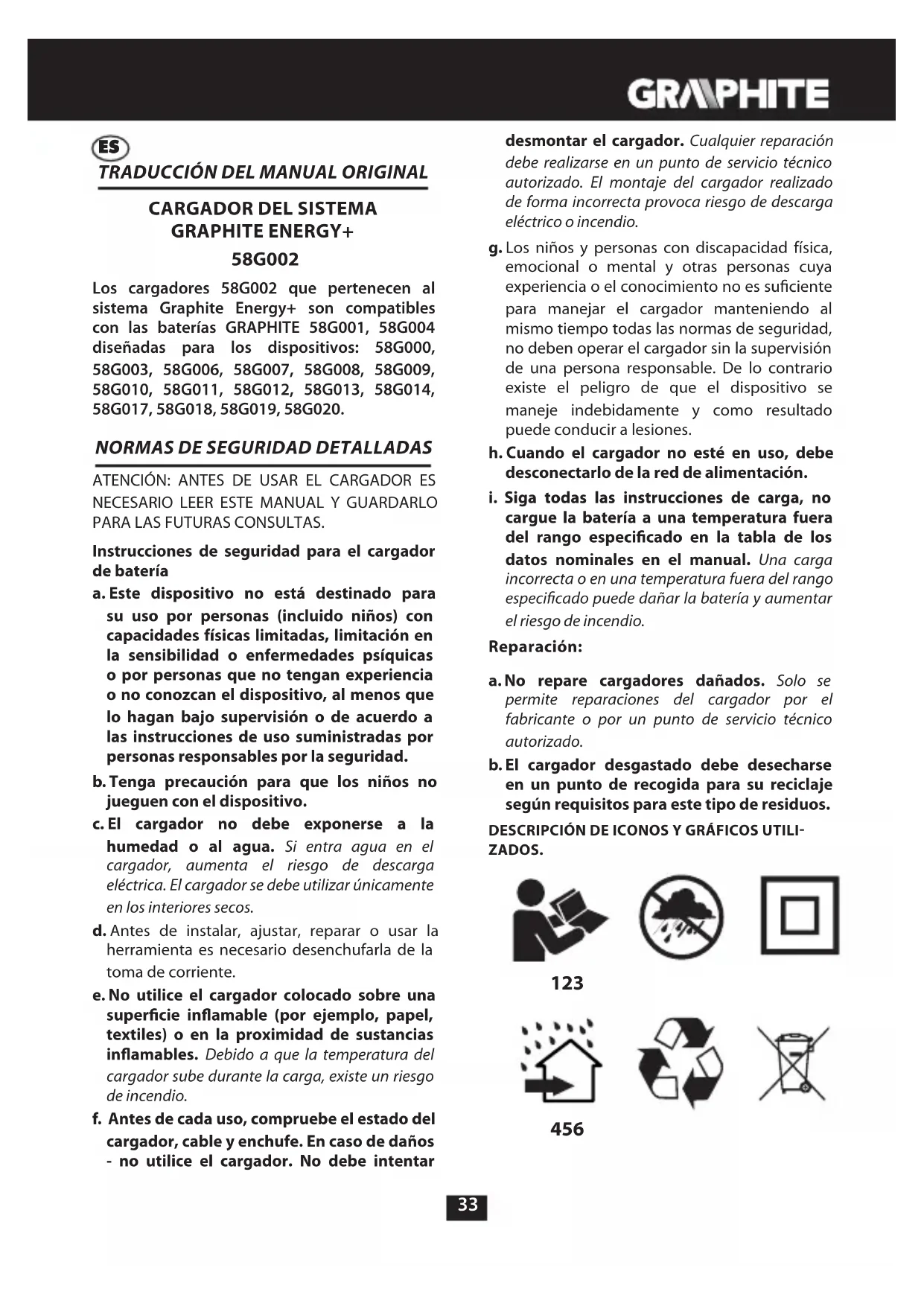 cargue la batería a una temperatura fuera del rango especicado en la tabla de los datos nominales en el manual. Una carga incorrecta o en una temperatura fuera del rango especicado puede dañar la batería y aumentar el riesgo de incendio. Reparación: a. No repare cargadores dañados. Solo se permite reparaciones del cargador por el fabricante o por un punto de servicio técnico autorizado. b. El cargador desgastado debe desecharse en un punto de recogida para su reciclaje según requisitos para este tipo de residuos. DESCRIPCIÓN DE ICONOS Y GRÁFICOS UTILI ZADOS.