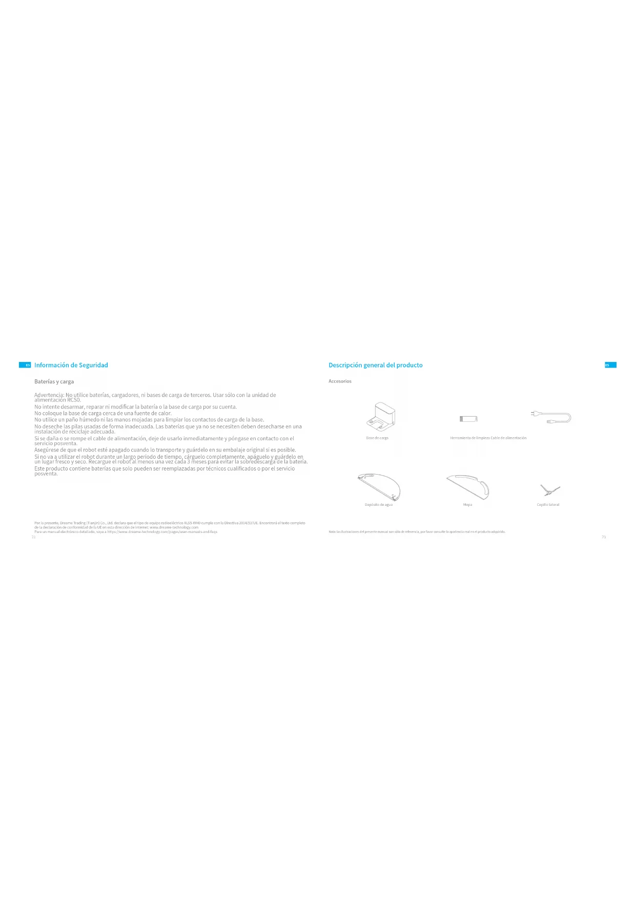 Accesorios Descripción general del producto Nota: las ilustraciones del presente manual son sólo de referencia, por favor consulte la apariencia real en el producto adquirido. Base de carga Depósito de agua Cepillo lateral Herramienta de limpieza Cable de alimentación Mopa Por la presente, Dreame Trading (Tianjin) Co., Ltd. declara que el tipo de equipo radioeléctrico RLS5-WH0 cumple con la Directiva 2014/53/UE. Encontrará el texto completo de la declaración de conformidad de la UE en esta dirección de Internet: www.dreame-technology.com Para un manual electrónico detallado, vaya a https://www.dreame-technology.com/pages/user-manuals-and-faqs Baterías y carga Información de Seguridad Advertencia: No utilice baterías, cargadores, ni bases de carga de terceros. Usar sólo con la unidad de alimentación RCS0. No intente desarmar, reparar ni modificar la batería o la base de carga por su cuenta. No coloque la base de carga cerca de una fuente de calor. No utilice un paño húmedo ni las manos mojadas para limpiar los contactos de carga de la base. No deseche las pilas usadas de forma inadecuada. Las baterías que ya no se necesiten deben desecharse en una instalación de reciclaje adecuada. Si se daña o se rompe el cable de alimentación, deje de usarlo inmediatamente y póngase en contacto con el servicio posventa. Asegúrese de que el robot esté apagado cuando lo transporte y guárdelo en su embalaje original si es posible. Si no va a utilizar el robot durante un largo periodo de tiempo, cárguelo completamente, apáguelo y guárdelo en un lugar fresco y seco. Recargue el robot al menos una vez cada 3 meses para evitar la sobredescarga de la batería. Este producto contiene baterías que solo pueden ser reemplazadas por técnicos cualificados o por el servicio posventa.80