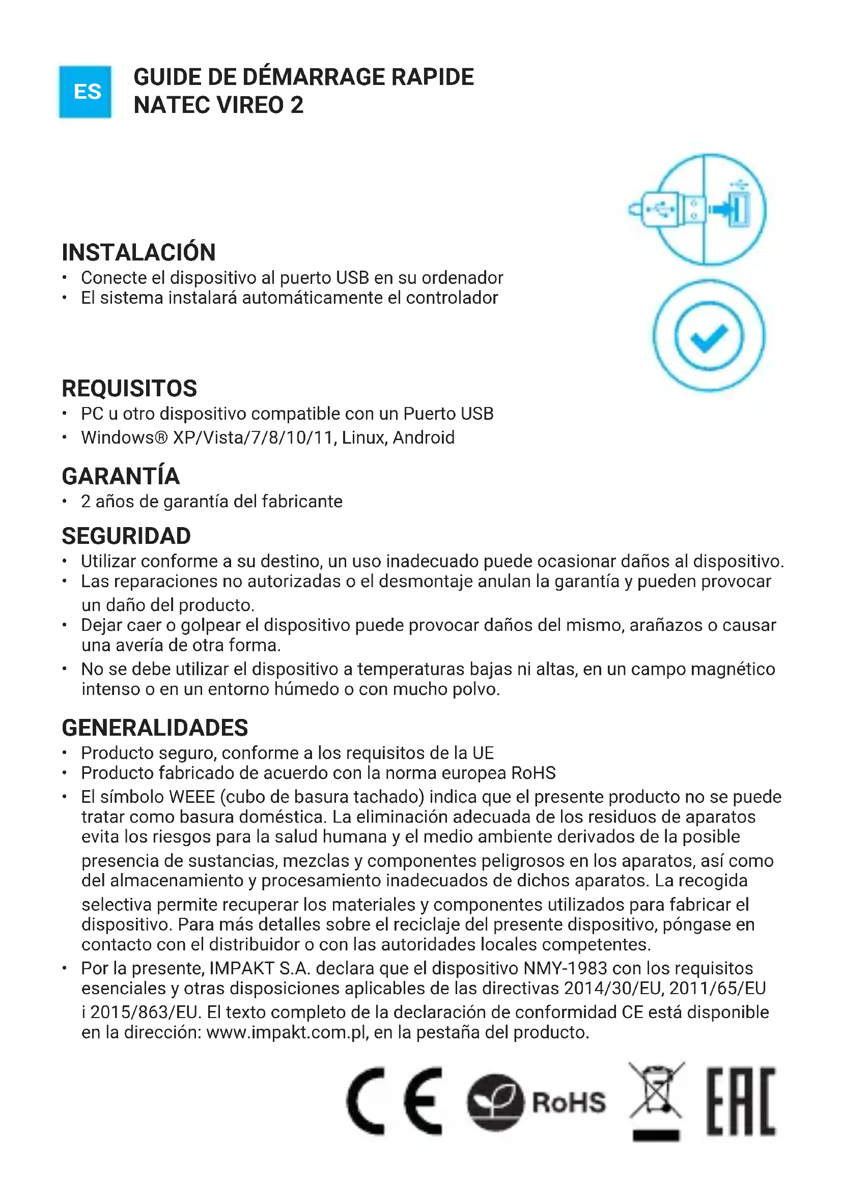 - Por la presente, IMPAKT S.A. declara que el dispositivo NMY-1983 con los requisitos esenciales y otras disposiciones aplicables de las directivas 2014/30/EU, 2011/65/EU i 2015/863/EU. El texto completo de la declaración de conformidad CE está disponible en la dirección: www.impakt.com.pl, en la pestaña del producto. GENERALIDADES
