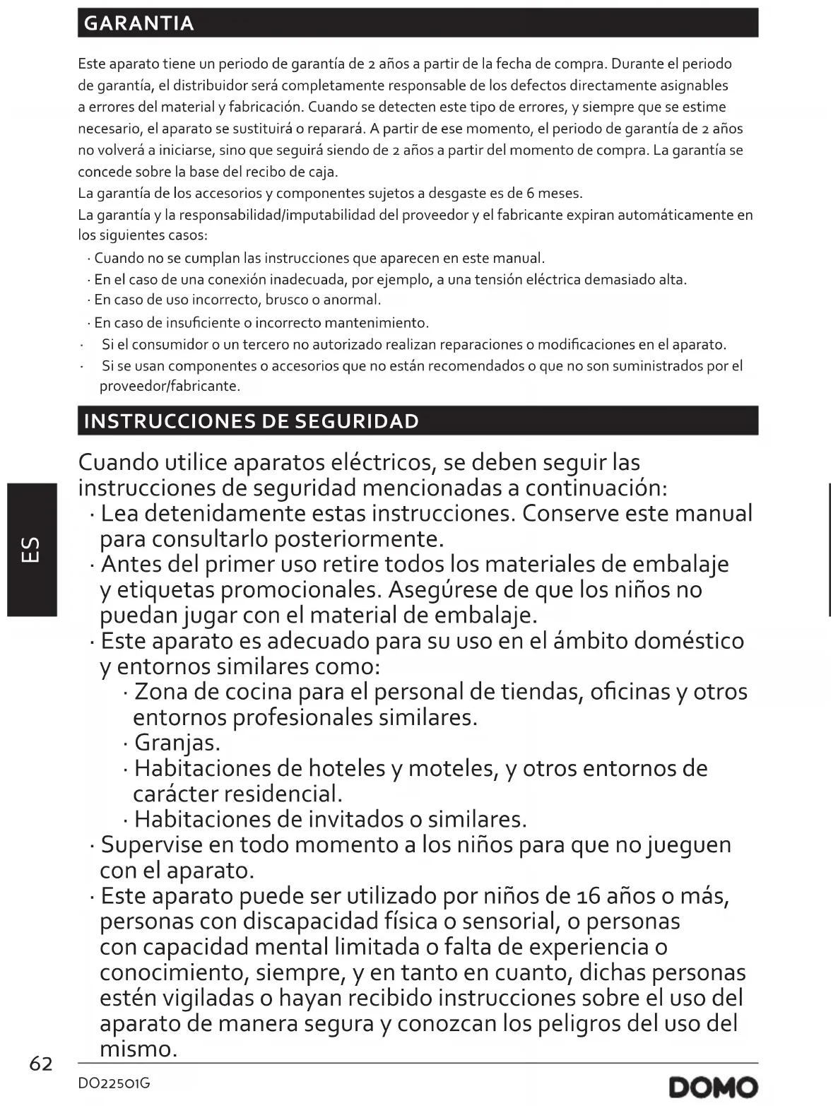 - Este aparato puede ser utilizado por niños de 16 años o más, personas con discapacidad física o sensorial, o personas con capacidad mental limitada o falta de experiencia o conocimiento, siempre, y en tanto en cuanto, dichas personas estén vigiladas o hayan recibido instrucciones sobre el uso del aparato de manera segura y conozcan los peligros del uso del mismo.63 DO22501G www.domo-elektro.be