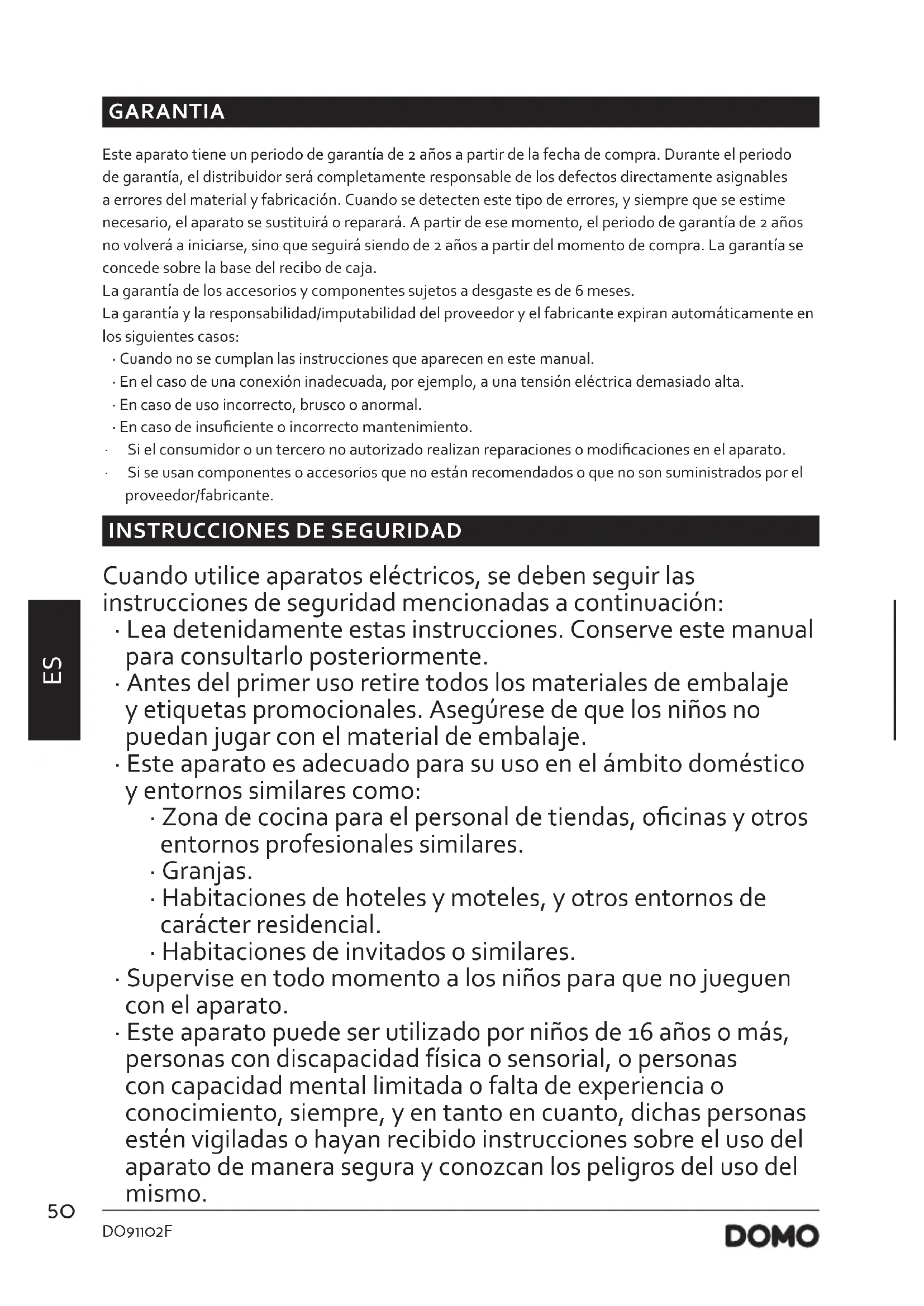 - Este aparato puede ser utilizado por niños de 16 años o más, personas con discapacidad física o sensorial, o personas con capacidad mental limitada o falta de experiencia o conocimiento, siempre, y en tanto en cuanto, dichas personas estén vigiladas o hayan recibido instrucciones sobre el uso del aparato de manera segura y conozcan los peligros del uso del mismo.51 DO91102F www.domo-elektro.be