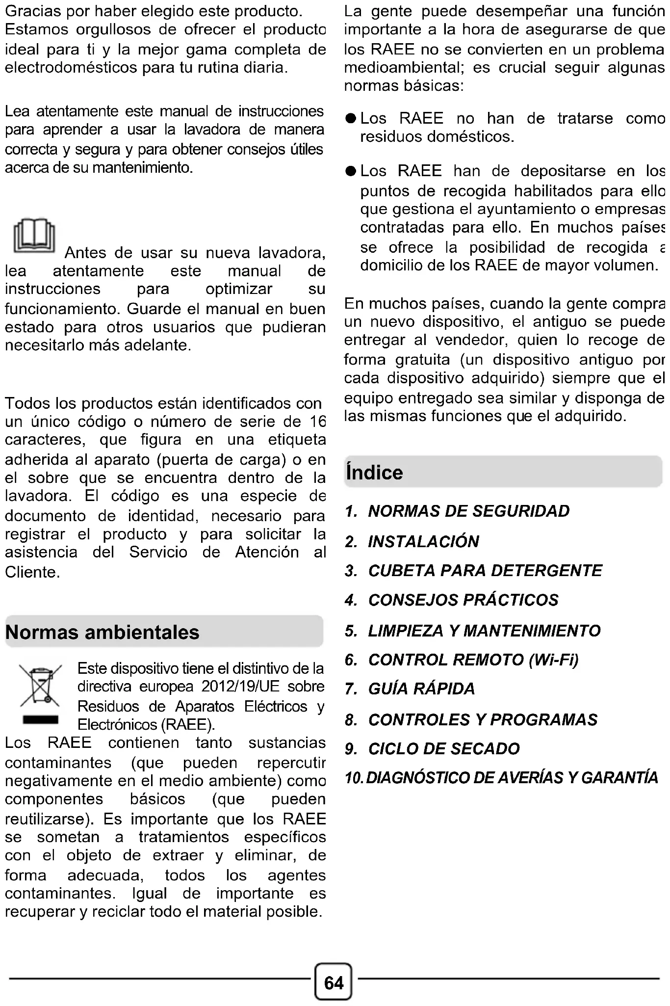 Lea atentamente este manual de instrucciones para aprender a usar la lavadora de manera correcta y segura y para obtener consejos útiles acerca de su mantenimiento.