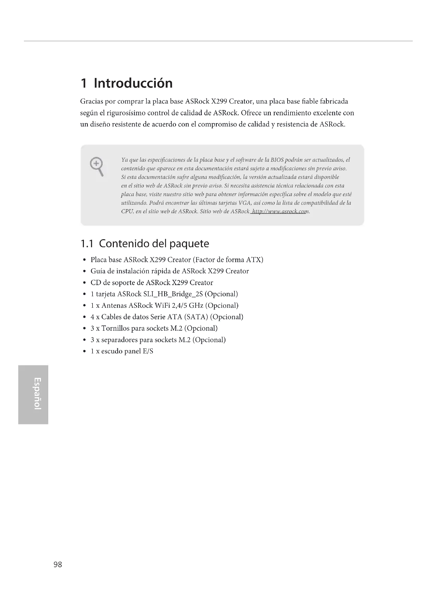 1 x escudo panel E/S Ya que las especicaciones de la placa base y el soware de la BIOS podrán ser actualizados, el contenido que aparece en esta documentación estará sujeto a modicaciones sin previo aviso. Si esta documentación sufre alguna modicación, la versión actualizada estará disponible en el sitio web de ASRock sin previo aviso. Si necesita asistencia técnica relacionada con esta placa base, visite nuestro sitio web para obtener información especíca sobre el modelo que esté utilizando. Podrá encontrar las últimas tarjetas VGA, así como la lista de compatibilidad de la CPU, en el sitio web de ASRock. Sitio web de ASRock http://www.asrock.com.99 X299 Creator Español