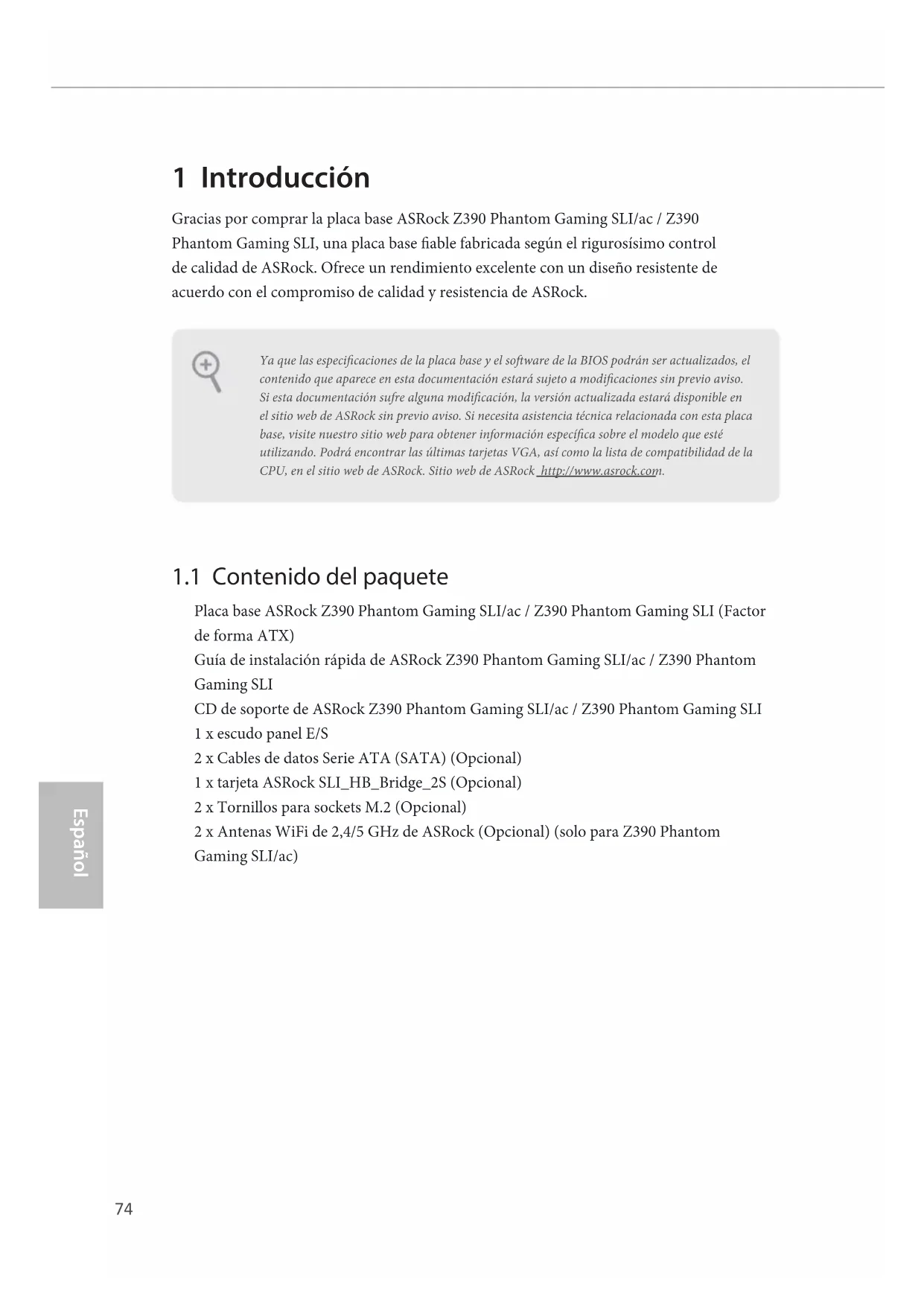 Español 1 Introducción Gracias por comprar la placa base ASRock Z390 Phantom Gaming SLI/ac / Z390 Phantom Gaming SLI, una placa base able fabricada según el rigurosísimo control de calidad de ASRock. Ofrece un rendimiento excelente con un diseño resistente de acuerdo con el compromiso de calidad y resistencia de ASRock.