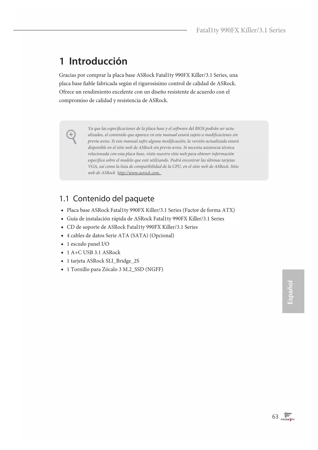 LFRAME #_LCK_33M _TPMTPM_RS T#LAD3_L +3V LAD0_L+3VSBGNDF_CLKR UN#SERIRQ #S_PWRD WN# GND LAD1_LLAD2_LSMB_DATA_M AINSMB_CL K_MAIN GND63 Español Fatal1ty 990FX Killer/3.1 Series 1 Introducción Gracias por comprar la placa base ASRock Fatal1ty 990FX Killer/3.1 Series, una placa base able fabricada según el rigurosísimo control de calidad de ASRock. Ofrece un rendimiento excelente con un diseño resistente de acuerdo con el compromiso de calidad y resistencia de ASRock.