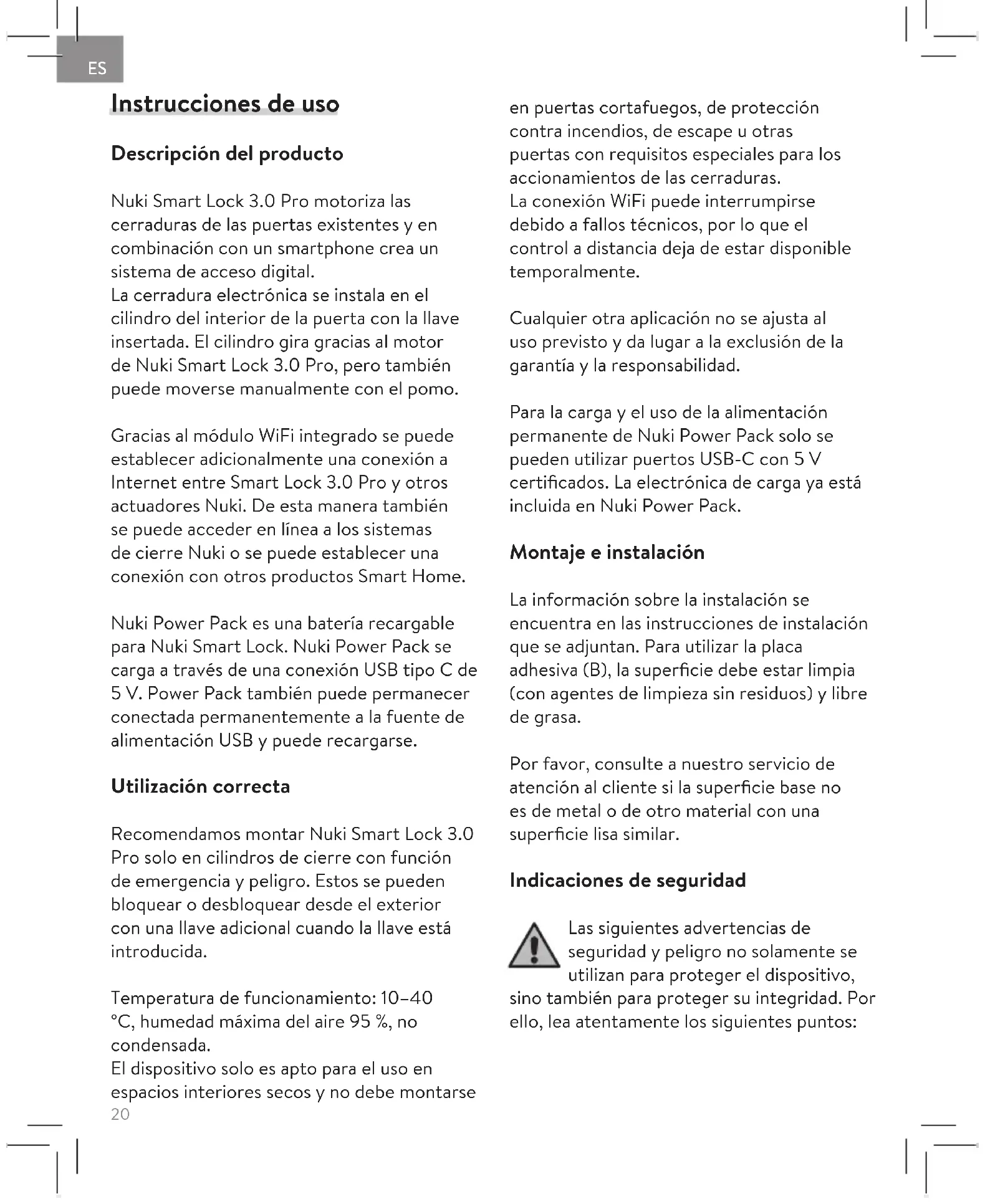 - normale slijtage. Zie voor meer informatie over de garantie: nuki.io/warranty Toepasbaar recht Deze garantie is onderhevig aan de wet van de Republiek Oostenrijk. Rechtsgebied is Graz, Oostenrijk. Contact E-Mail : service@nuki.io Overige mogelijkheden voor contact met Nuki Support vindt u op: nuki.io/help Bewaar deze instructies en de gebruikershandleiding voor later! Hiermee verklaart Nuki Home Solutions GmbH dat het radioapparatuurtype Nuki Smart Lock 3.0 Pro (011.318) voldoet aan de richtlijn 2014/53/EU. De volledige tekst van de EU- conformiteitsverklaring is beschikbaar op het volgende internetadres: nuki.io/legal NL20 Instrucciones de uso Descripción del producto Nuki Smart Lock 3.0 Pro motoriza las cerraduras de las puertas existentes y en combinación con un smartphone crea un sistema de acceso digital. La cerradura electrónica se instala en el cilindro del interior de la puerta con la llave insertada. El cilindro gira gracias al motor de Nuki Smart Lock 3.0 Pro, pero también puede moverse manualmente con el pomo. Gracias al módulo WiFi integrado se puede establecer adicionalmente una conexión a Internet entre Smart Lock 3.0 Pro y otros actuadores Nuki. De esta manera también se puede acceder en línea a los sistemas de cierre Nuki o se puede establecer una conexión con otros productos Smart Home. Nuki Power Pack es una batería recargable para Nuki Smart Lock. Nuki Power Pack se carga a través de una conexión USB tipo C de 5 V. Power Pack también puede permanecer conectada permanentemente a la fuente de alimentación USB y puede recargarse. Utilización correcta Recomendamos montar Nuki Smart Lock 3.0 Pro solo en cilindros de cierre con función de emergencia y peligro. Estos se pueden bloquear o desbloquear desde el exterior con una llave adicional cuando la llave está introducida. Temperatura de funcionamiento: 10–40 °C, humedad máxima del aire 95 %, no condensada. El dispositivo solo es apto para el uso en espacios interiores secos y no debe montarse en puertas cortafuegos, de protección contra incendios, de escape u otras puertas con requisitos especiales para los accionamientos de las cerraduras. La conexión WiFi puede interrumpirse debido a fallos técnicos, por lo que el control a distancia deja de estar disponible temporalmente. Cualquier otra aplicación no se ajusta al uso previsto y da lugar a la exclusión de la garantía y la responsabilidad. Para la carga y el uso de la alimentación permanente de Nuki Power Pack solo se pueden utilizar puertos USB-C con 5 V certificados. La electrónica de carga ya está incluida en Nuki Power Pack. Montaje e instalación La información sobre la instalación se encuentra en las instrucciones de instalación que se adjuntan. Para utilizar la placa adhesiva (B), la superficie debe estar limpia (con agentes de limpieza sin residuos) y libre de grasa. Por favor, consulte a nuestro servicio de atención al cliente si la superficie base no es de metal o de otro material con una superficie lisa similar. Indicaciones de seguridad Las siguientes advertencias de seguridad y peligro no solamente se utilizan para proteger el dispositivo, sino también para proteger su integridad. Por ello, lea atentamente los siguientes puntos: ES21