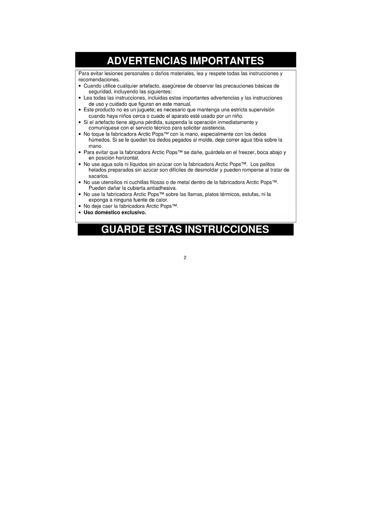 - No use la fabricadora Arctic Pops™ sobre las llamas, platos térmicos, estufas, ni la exponga a ninguna fuente de calor.