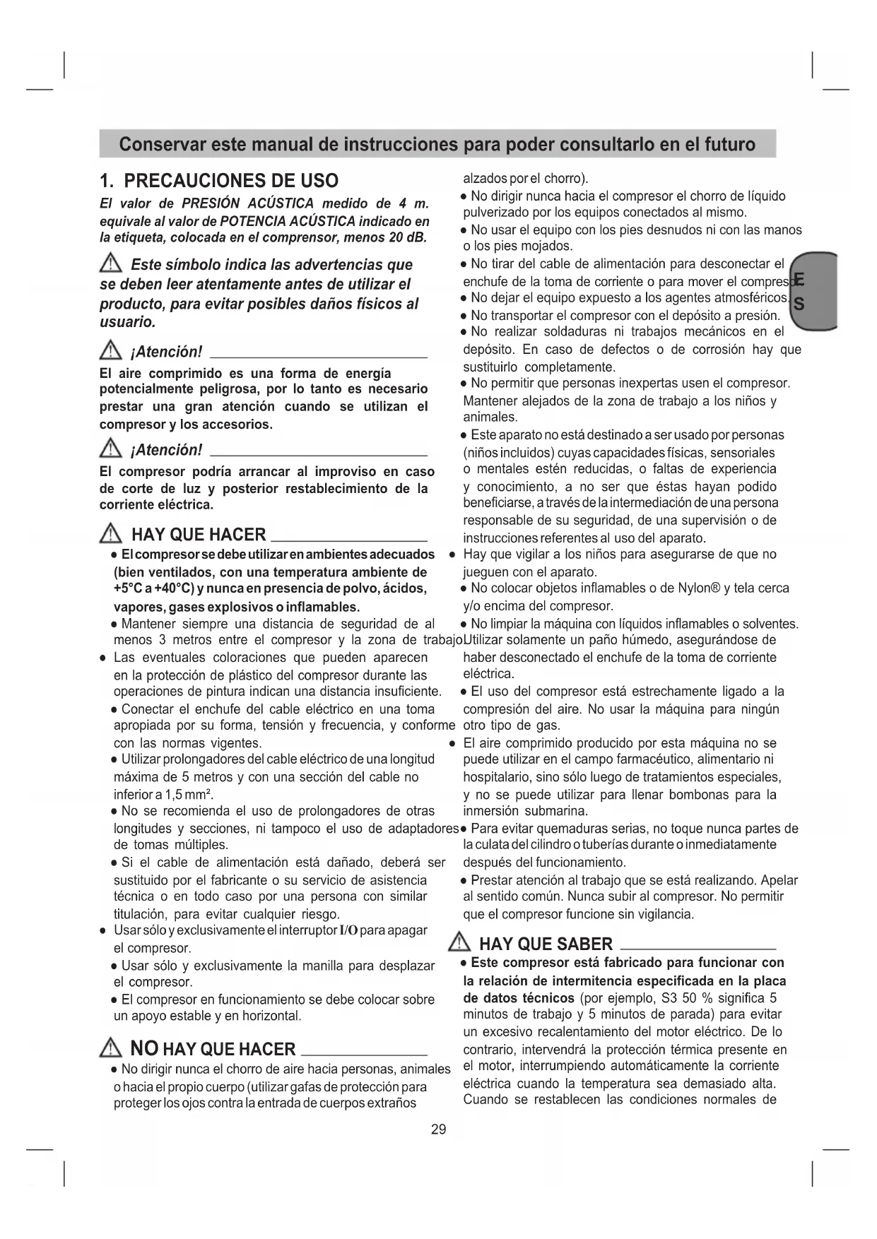 ● Este compresor está fabricado para funcionar con la relación de intermitencia especicada en la placa de datos técnicos (por ejemplo, S3 50 % signica 5 minutos de trabajo y 5 minutos de parada) para evitar un excesivo recalentamiento del motor eléctrico. De lo contrario, intervendrá la protección térmica presente en el motor, interrumpiendo automáticamente la corriente eléctrica cuando la temperatura sea demasiado alta. Cuando se restablecen las condiciones normales de Conservar este manual de instrucciones para poder consultarlo en el futuroE