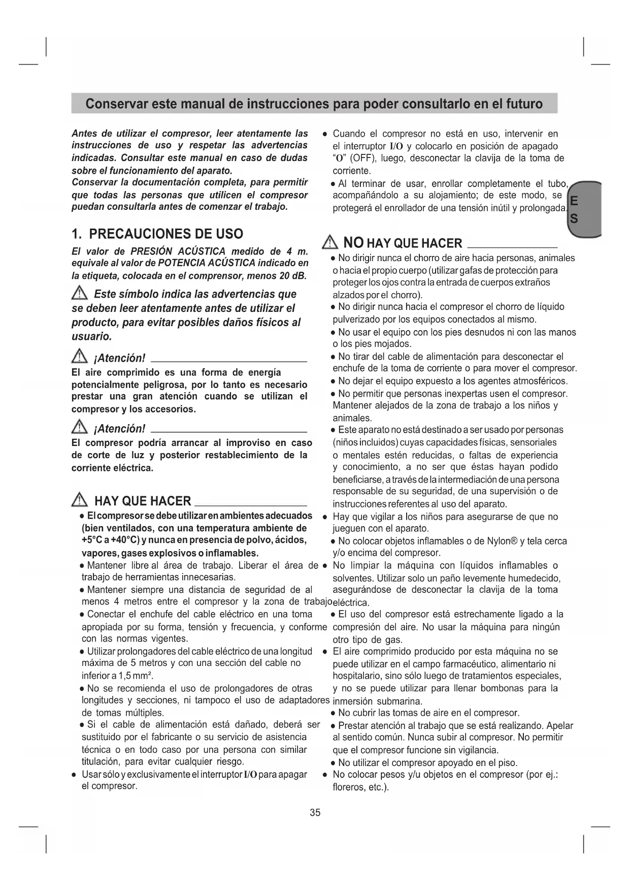 ● No dirigir nunca el chorro de aire hacia personas, animales o hacia el propio cuerpo (utilizar gafas de protección para proteger los ojos contra la entrada de cuerpos extraños alzados por el chorro). ● No dirigir nunca hacia el compresor el chorro de líquido pulverizado por los equipos conectados al mismo. ● No usar el equipo con los pies desnudos ni con las manos o los pies mojados. ● No tirar del cable de alimentación para desconectar el enchufe de la toma de corriente o para mover el compresor. ● No dejar el equipo expuesto a los agentes atmosféricos. ● No permitir que personas inexpertas usen el compresor. Mantener alejados de la zona de trabajo a los niños y animales. ● Este aparato no está destinado a ser usado por personas (niños incluidos) cuyas capacidades físicas, sensoriales o mentales estén reducidas, o faltas de experiencia y conocimiento, a no ser que éstas hayan podido beneciarse, a través de la intermediación de una persona responsable de su seguridad, de una supervisión o de instrucciones referentes al uso del aparato. ● Hay que vigilar a los niños para asegurarse de que no jueguen con el aparato. ● No colocar objetos inamables o de Nylon® y tela cerca y/o encima del compresor. ● No limpiar la máquina con líquidos inamables o solventes. Utilizar solo un paño levemente humedecido, asegurándose de desconectar la clavija de la toma eléctrica. ● El uso del compresor está estrechamente ligado a la compresión del aire. No usar la máquina para ningún otro tipo de gas. ● El aire comprimido producido por esta máquina no se puede utilizar en el campo farmacéutico, alimentario ni hospitalario, sino sólo luego de tratamientos especiales, y no se puede utilizar para llenar bombonas para la inmersión submarina. ● No cubrir las tomas de aire en el compresor. ● Prestar atención al trabajo que se está realizando. Apelar al sentido común. Nunca subir al compresor. No permitir que el compresor funcione sin vigilancia. ● No utilizar el compresor apoyado en el piso. ● No colocar pesos y/u objetos en el compresor (por ej.: oreros, etc.). Conservar este manual de instrucciones para poder consultarlo en el futuroE