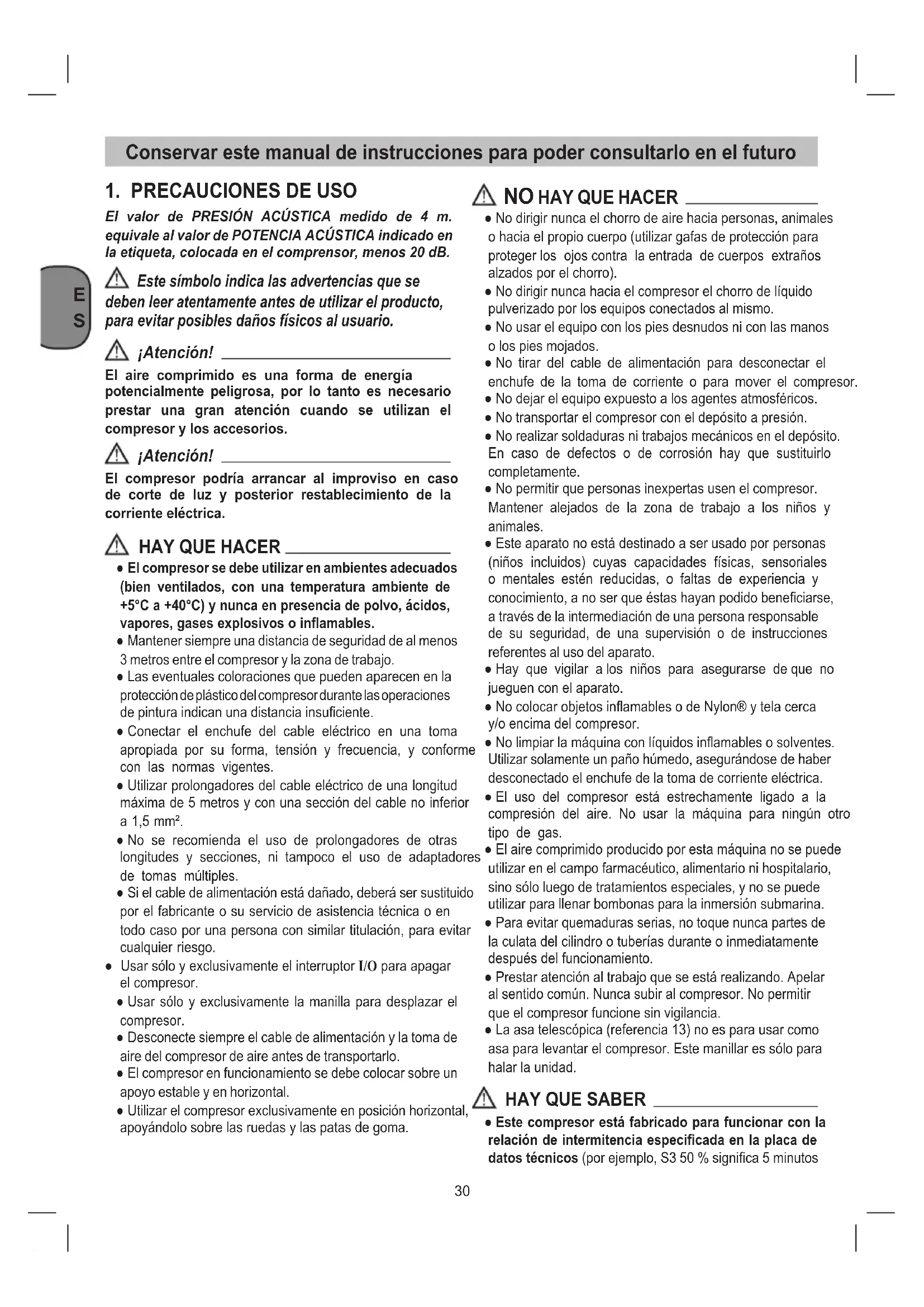 ● Este compresor está fabricado para funcionar con la relación de intermitencia especicada en la placa de datos técnicos (por ejemplo, S3 50 % signica 5 minutos Conservar este manual de instrucciones para poder consultarlo en el futuroE