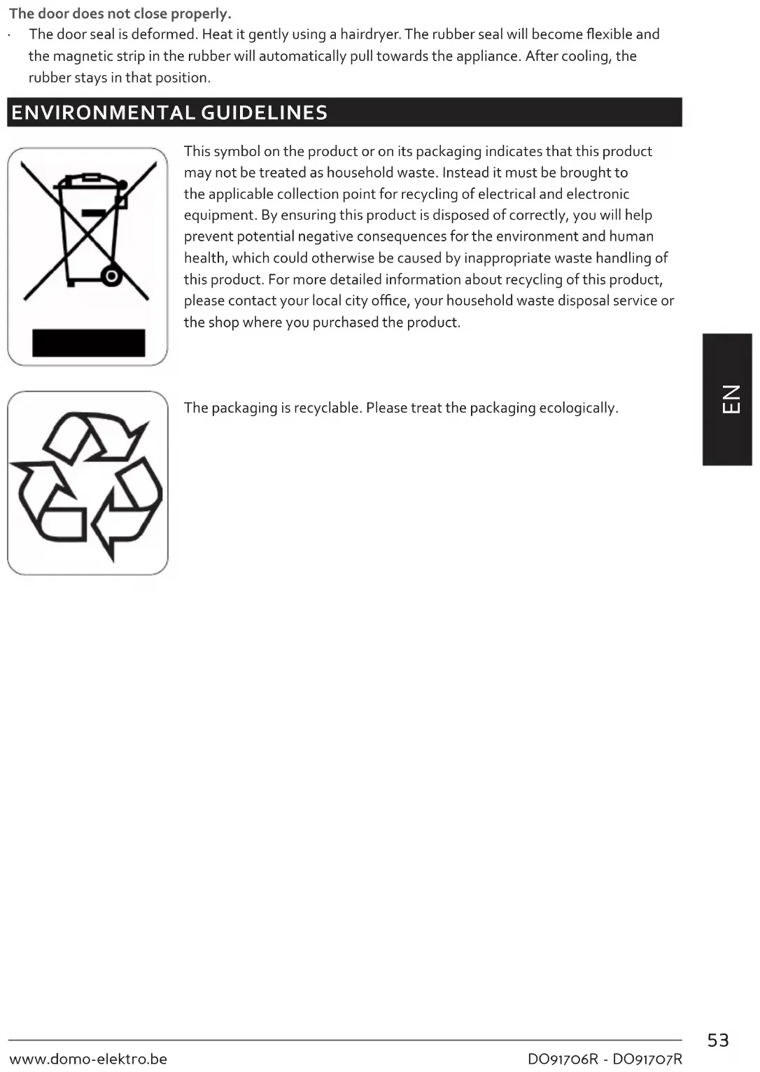 - La junta de la puerta está deformada. Caliéntelo con cuidado utilizando un secador de pelo. El sello de goma adquirirá exibilidad y la banda magnética de la goma se ajustará automáticamente al dispositivo. Tras enfriarse, la goma se mantendrá en su posición. DIRECTRICES MEDIOAMBIENTALES El símbolo en el producto o en el embalaje indica que este producto no puede ser tratado como residuo doméstico. Se debe llevar a un lugar en el que se reciclan equipos eléctricos y electrónicos. Si se asegura de que este producto se desecha correctamente, usted ayudará a evitar posibles consecuencias negativas para las personas y el medio ambiente que serían causadospor un tratamiento de residuos inadecuado. Para obtener información más detallada sobre el reciclaje de este producto, póngase en contacto con su ayuntamiento, o con la empresa o departamento responsable del servicio de recogida de basura doméstica, o con la tienda donde adquirió el producto. El material de embalaje es reciclable. Trate el embalaje de una manera medioambientalmente responsable.66 DO91706R - DO91707R