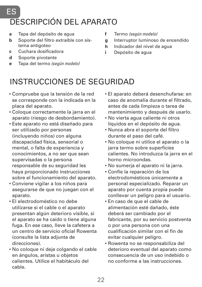 - El electrodoméstico no debe utilizarse si el cable o el aparato presentan algún deterioro visible, si el aparato se ha caído o tiene alguna fuga. En ese caso, lleve la cafetera a un centro de servicio oficial Rowenta (consulte la lista adjunta de direcciones).