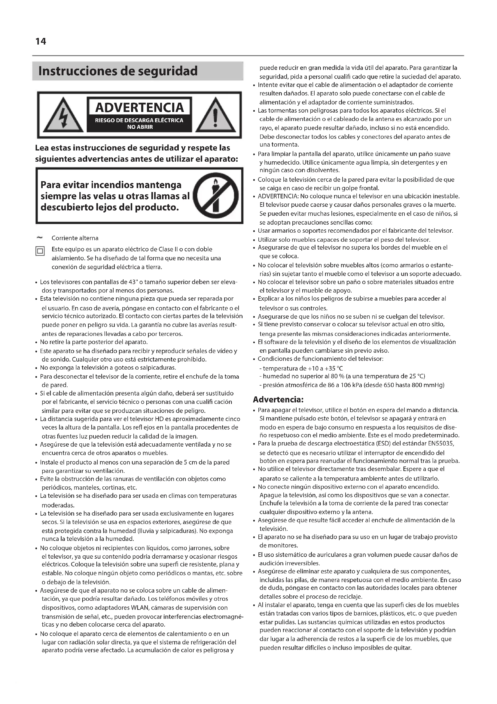 Lea estas instrucciones de seguridad y respete las siguientes advertencias antes de utilizar el aparato: Para evitar incendios mantenga siempre las velas u otras llamas al descubierto lejos del producto. Corriente alterna Este equipo es un aparato eléctrico de ClaseII o con doble aislamiento. Se ha diseñado de tal forma que no necesita una conexión de seguridad eléctrica a tierra.