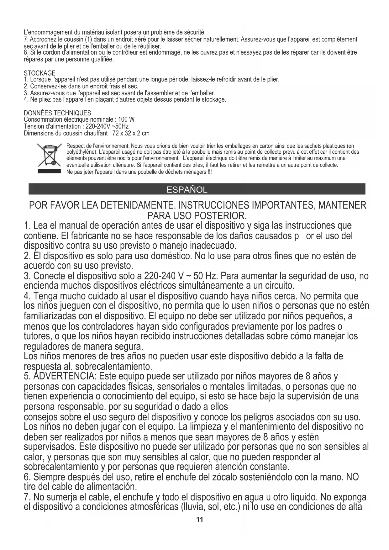 Consumo de energía nominal: 100W Tensión de alimentación: 220-240V ~50Hz Dimensiones de la almohadilla térmica: 72 x 32 x 2 cm14 Preocupación por el medio ambiente. Por favor, lleva las cajas de cartón a un sitio de reciclaje. Las bolsas de polietileno se deben tirar al cubo de la basura amarillo (para envases). El equipo gastado debe ser entregado en el punto de almacenamiento adecuado, porque las piezas que constituyen el equipo pueden suponer un peligro para el medio ambiente. Debes entregar el equipo Hay que devolver el equipo eléctrico con el fin de evitar su reutilización. Si en el equipo se encuentran pilas, hay que sacarlas y entregar por separado, en un punto de almacenamiento adecuado. No tires el equipo al contenedor para residuos urbanos!! PORTUGUÊS POR FAVOR, LEIA ATENTAMENTE. INSTRUÇÕES IMPORTANTES, MANTENHA PARA UTILIZAÇÃO MAIS TARDE.