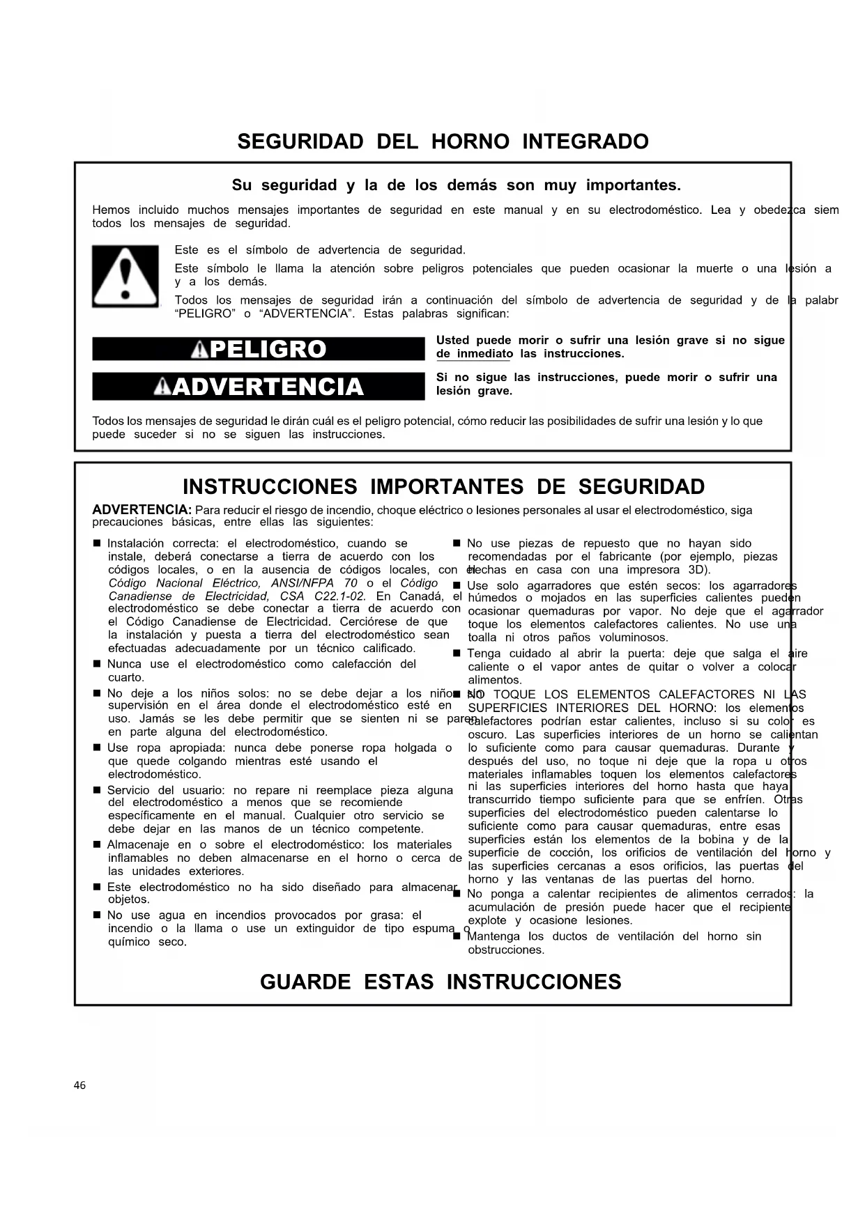 ADVERTENCIA: Para reducir el riesgo de incendio, choque eléctrico o lesiones personales al usar el electrodoméstico, siga precauciones básicas, entre ellas las siguientes: Instalación correcta: el electrodoméstico, cuando se instale, deberá conectarse a tierra de acuerdo con los códigos locales, o en la ausencia de códigos locales, con el Código Nacional Eléctrico, ANSI/NFPA 70 o el Código Canadiense de Electricidad, CSA C22.1-02. En Canadá, el electrodoméstico se debe conectar a tierra de acuerdo con el Código Canadiense de Electricidad. Cerciórese de que la instalación y puesta a tierra del electrodoméstico sean efectuadas adecuadamente por un técnico calificado. Nunca use el electrodoméstico como calefacción del cuarto. No deje a los niños solos: no se debe dejar a los niños sin supervisión en el área donde el electrodoméstico esté en uso. Jamás se les debe permitir que se sienten ni se paren en parte alguna del electrodoméstico. Use ropa apropiada: nunca debe ponerse ropa holgada o que quede colgando mientras esté usando el electrodoméstico. Servicio del usuario: no repare ni reemplace pieza alguna del electrodoméstico a menos que se recomiende específicamente en el manual. Cualquier otro servicio se debe dejar en las manos de un técnico competente. Almacenaje en o sobre el electrodoméstico: los materiales inflamables no deben almacenarse en el horno o cerca de las unidades exteriores. Este electrodoméstico no ha sido diseñado para almacenar objetos. No use agua en incendios provocados por grasa: el incendio o la llama o use un extinguidor de tipo espuma o químico seco. No use piezas de repuesto que no hayan sido recomendadas por el fabricante (por ejemplo, piezas hechas en casa con una impresora 3D). Use solo agarradores que estén secos: los agarradores húmedos o mojados en las superficies calientes pueden ocasionar quemaduras por vapor. No deje que el agarrador toque los elementos calefactores calientes. No use una toalla ni otros paños voluminosos. Tenga cuidado al abrir la puerta: deje que salga el aire caliente o el vapor antes de quitar o volver a colocar alimentos. NO TOQUE LOS ELEMENTOS CALEFACTORES NI LAS SUPERFICIES INTERIORES DEL HORNO: los elementos calefactores podrían estar calientes, incluso si su color es oscuro. Las superficies interiores de un horno se calientan lo suficiente como para causar quemaduras. Durante y después del uso, no toque ni deje que la ropa u otros materiales inflamables toquen los elementos calefactores ni las superficies interiores del horno hasta que haya transcurrido tiempo suficiente para que se enfríen. Otras superficies del electrodoméstico pueden calentarse lo suficiente como para causar quemaduras, entre esas superficies están los elementos de la bobina y de la superficie de cocción, los orificios de ventilación del horno y las superficies cercanas a esos orificios, las puertas del horno y las ventanas de las puertas del horno. No ponga a calentar recipientes de alimentos cerrados: la acumulación de presión puede hacer que el recipiente explote y ocasione lesiones. Mantenga los ductos de ventilación del horno sin obstrucciones.