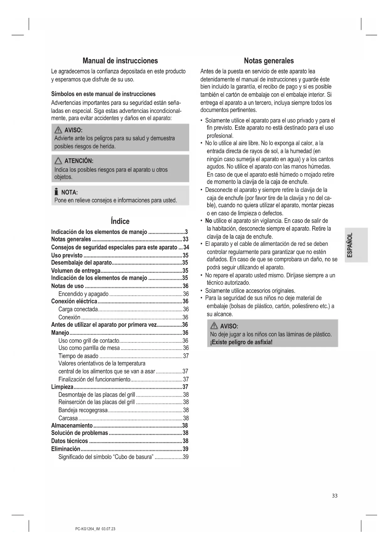- Para la seguridad de sus niños no deje material de embalaje (bolsas de plástico, cartón, poliestireno etc.) a su alcance. AVISO: No deje jugar a los niños con las láminas de plástico. ¡Existe peligro de asxia!PC-KG1264_IM 03.07.23