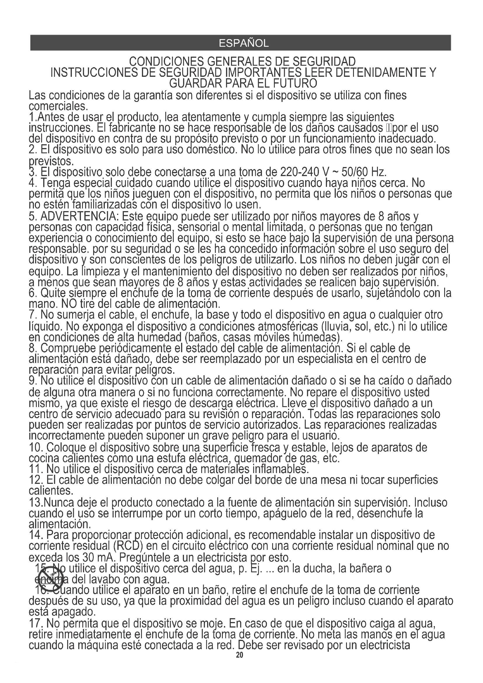 Las condiciones de la garantía son diferentes si el dispositivo se utiliza con fines comerciales. 1.Antes de usar el producto, lea atentamente y cumpla siempre las siguientes instrucciones. El fabricante no se hace responsable de los daños causados por el uso del dispositivo en contra de su propósito previsto o por un funcionamiento inadecuado.