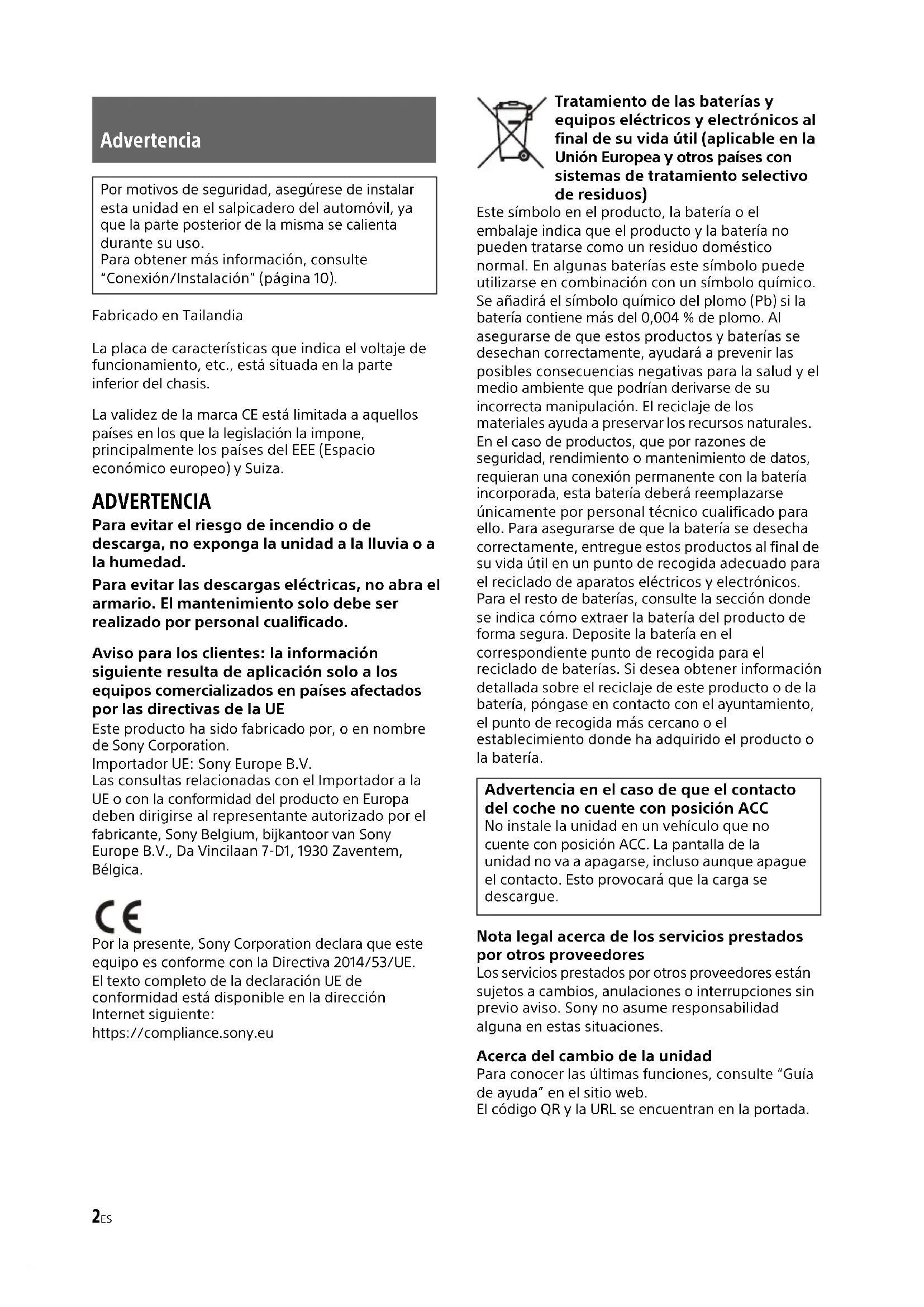 züglich des Inhalts des Quellcodes beantworten oder darauf reagieren kann.2ES Fabricado en Tailandia La placa de características que indica el voltaje de funcionamiento, etc., está situada en la parte inferior del chasis. La validez de la marca CE está limitada a aquellos países en los que la legislación la impone, principalmente los países del EEE (Espacio económico europeo) y Suiza. ADVERTENCIA Para evitar el riesgo de incendio o de descarga, no exponga la unidad a la lluvia o a la humedad. Para evitar las descargas eléctricas, no abra el armario. El mantenimiento solo debe ser realizado por personal cualificado. Aviso para los clientes: la información siguiente resulta de aplicación solo a los equipos comercializados en países afectados por las directivas de la UE Este producto ha sido fabricado por, o en nombre de Sony Corporation. Importador UE: Sony Europe B.V. Las consultas relacionadas con el Importador a la UE o con la conformidad del producto en Europa deben dirigirse al representante autorizado por el fabricante, Sony Belgium, bijkantoor van Sony Europe B.V., Da Vincilaan 7-D1, 1930 Zaventem, Bélgica. Por la presente, Sony Corporation declara que este equipo es conforme con la Directiva 2014/53/UE. El texto completo de la declaración UE de conformidad está disponible en la dirección Internet siguiente: https://compliance.sony.eu Tratamiento de las baterías y equipos eléctricos y electrónicos al final de su vida útil (aplicable en la Unión Europea y otros países con sistemas de tratamiento selectivo de residuos) Este símbolo en el producto, la batería o el embalaje indica que el producto y la batería no pueden tratarse como un residuo doméstico normal. En algunas baterías este símbolo puede utilizarse en combinación con un símbolo químico. Se añadirá el símbolo químico del plomo (Pb) si la batería contiene más del 0,004 % de plomo. Al asegurarse de que estos productos y baterías se desechan correctamente, ayudará a prevenir las posibles consecuencias negativas para la salud y el medio ambiente que podrían derivarse de su incorrecta manipulación. El reciclaje de los materiales ayuda a preservar los recursos naturales. En el caso de productos, que por razones de seguridad, rendimiento o mantenimiento de datos, requieran una conexión permanente con la batería incorporada, esta batería deberá reemplazarse únicamente por personal técnico cualificado para ello. Para asegurarse de que la batería se desecha correctamente, entregue estos productos al final de su vida útil en un punto de recogida adecuado para el reciclado de aparatos eléctricos y electrónicos. Para el resto de baterías, consulte la sección donde se indica cómo extraer la batería del producto de forma segura. Deposite la batería en el correspondiente punto de recogida para el reciclado de baterías. Si desea obtener información detallada sobre el reciclaje de este producto o de la batería, póngase en contacto con el ayuntamiento, el punto de recogida más cercano o el establecimiento donde ha adquirido el producto o la batería. Nota legal acerca de los servicios prestados por otros proveedores Los servicios prestados por otros proveedores están sujetos a cambios, anulaciones o interrupciones sin previo aviso. Sony no asume responsabilidad alguna en estas situaciones. Acerca del cambio de la unidad Para conocer las últimas funciones, consulte “Guía de ayuda” en el sitio web. El código QR y la URL se encuentran en la portada. Advertencia Por motivos de seguridad, asegúrese de instalar esta unidad en el salpicadero del automóvil, ya que la parte posterior de la misma se calienta durante su uso. Para obtener más información, consulte “Conexión/Instalación” (página 10). Advertencia en el caso de que el contacto del coche no cuente con posición ACC No instale la unidad en un vehículo que no cuente con posición ACC. La pantalla de la unidad no va a apagarse, incluso aunque apague el contacto. Esto provocará que la carga se descargue.3ES Precaución SONY NO SE HACE RESPONSABLE EN NINGÚN CASO DE DAÑOS ACCIDENTALES, INDIRECTOS, COLATERALES O DE OTRO TIPO, LO QUE INCLUYE, A TÍTULO MERAMENTE ENUNCIATIVO, LA PÉRDIDA DE BENEFICIOS, LA PÉRDIDA DE INGRESOS, LA PÉRDIDA DE DATOS, LA IMPOSIBILIDAD DE UTILIZAR EL PRODUCTO O EQUIPOS ASOCIADOS, EL TIEMPO DE INACTIVIDAD O EL TIEMPO DEL COMPRADOR EN RELACIÓN CON LA UTILIZACIÓN DE ESTE PRODUCTO, SU HARDWARE Y/O SU SOFTWARE. Tenga en cuenta que este producto incluye un