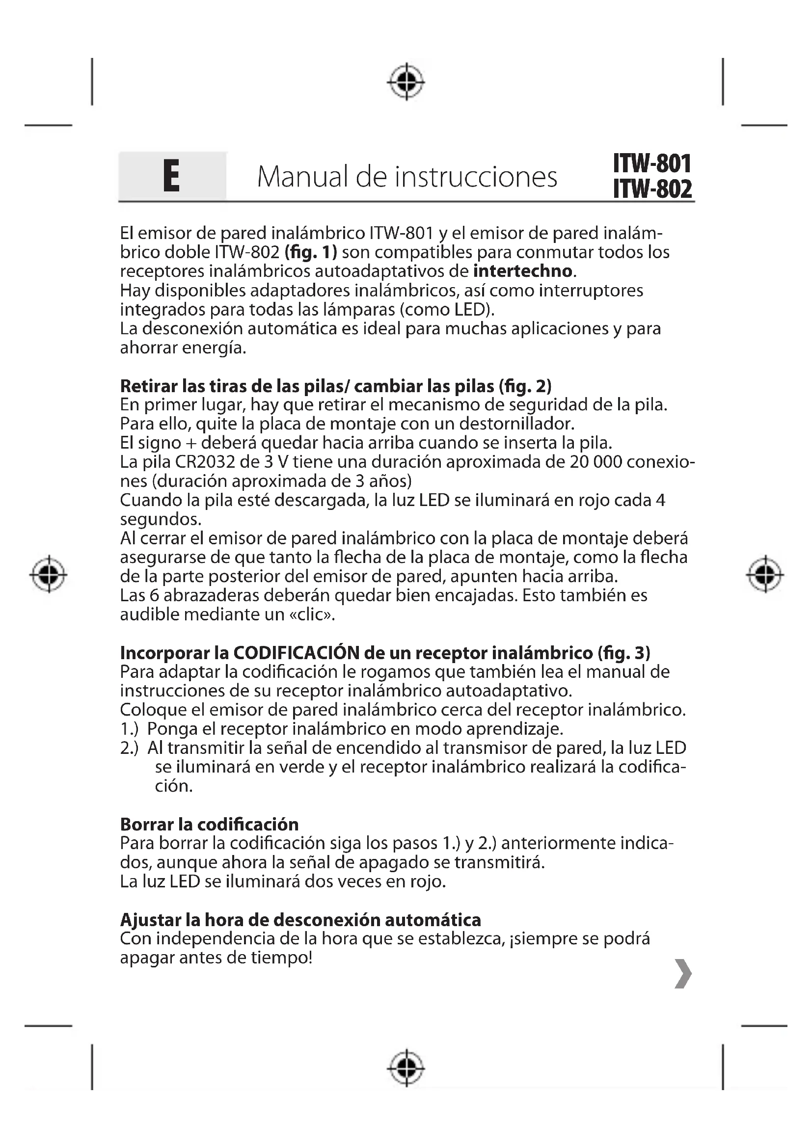 Betjeningsvejledning ITW-801 ITW-802El emisor de pared inalámbrico ITW-801 y el emisor de pared inalám- brico doble ITW-802 (fig. 1) son compatibles para conmutar todos los receptores inalámbricos autoadaptativos de intertechno. Hay disponibles adaptadores inalámbricos, así como interruptores integrados para todas las lámparas (como LED). La desconexión automática es ideal para muchas aplicaciones y para ahorrar energía. Retirar las tiras de las pilas/ cambiar las pilas (fig. 2) En primer lugar, hay que retirar el mecanismo de seguridad de la pila. Para ello, quite la placa de montaje con un destornillador. El signo + deberá quedar hacia arriba cuando se inserta la pila. La pila CR2032 de 3 V tiene una duración aproximada de 20 000 conexio- nes (duración aproximada de 3 años) Cuando la pila esté descargada, la luz LED se iluminará en rojo cada 4 segundos. Al cerrar el emisor de pared inalámbrico con la placa de montaje deberá asegurarse de que tanto la flecha de la placa de montaje, como la flecha de la parte posterior del emisor de pared, apunten hacia arriba. Las 6 abrazaderas deberán quedar bien encajadas. Esto también es audible mediante un «clic». Incorporar la CODIFICACIÓN de un receptor inalámbrico (fig. 3) Para adaptar la codificación le rogamos que también lea el manual de instrucciones de su receptor inalámbrico autoadaptativo. Coloque el emisor de pared inalámbrico cerca del receptor inalámbrico. 1.) Ponga el receptor inalámbrico en modo aprendizaje. 2.) Al transmitir la señal de encendido al transmisor de pared, la luz LED se iluminará en verde y el receptor inalámbrico realizará la codifica- ción. Borrar la codificación Para borrar la codificación siga los pasos 1.) y 2.) anteriormente indica- dos, aunque ahora la señal de apagado se transmitirá. La luz LED se iluminará dos veces en rojo. Ajustar la hora de desconexión automática Con independencia de la hora que se establezca, ¡siempre se podrá apagar antes de tiempo!