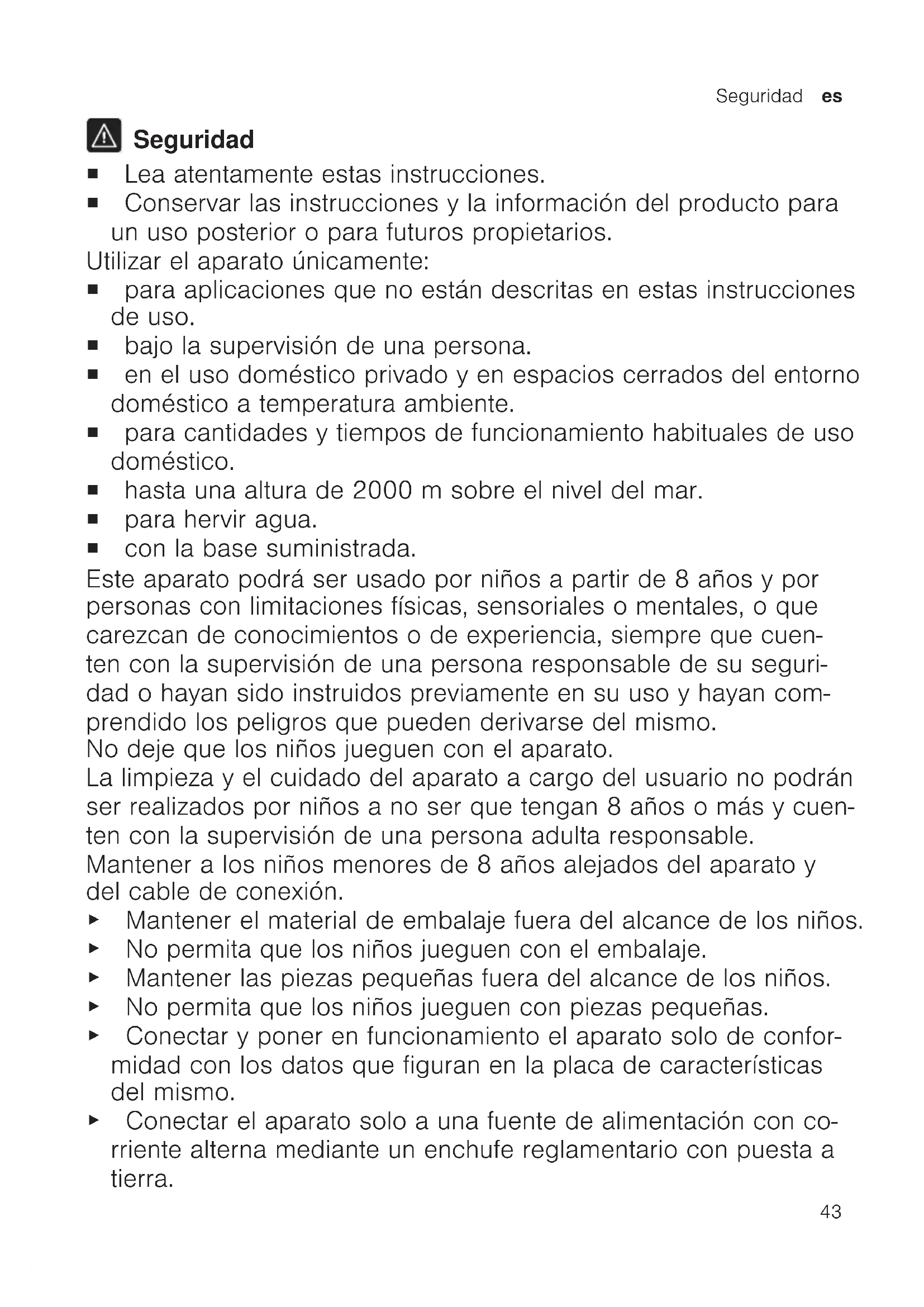 Seguridad ¡ Lea atentamente estas instrucciones. ¡ Conservar las instrucciones y la información del producto para un uso posterior o para futuros propietarios. Utilizar el aparato únicamente: ¡ para aplicaciones que no están descritas en estas instrucciones de uso. ¡ bajo la supervisión de una persona. ¡ en el uso doméstico privado y en espacios cerrados del entorno doméstico a temperatura ambiente. ¡ para cantidades y tiempos de funcionamiento habituales de uso doméstico. ¡ hasta una altura de 2000msobre el nivel del mar. ¡ para hervir agua. ¡ con la base suministrada. Este aparato podrá ser usado por niños a partir de 8 años y por personas con limitaciones físicas, sensoriales o mentales, o que carezcan de conocimientos o de experiencia, siempre que cuen- ten con la supervisión de una persona responsable de su seguri- dad o hayan sido instruidos previamente en su uso y hayan com- prendido los peligros que pueden derivarse del mismo. No deje que los niños jueguen con el aparato. La limpieza y el cuidado del aparato a cargo del usuario no podrán ser realizados por niños a no ser que tengan 8 años o más y cuen- ten con la supervisión de una persona adulta responsable. Mantener a los niños menores de 8 años alejados del aparato y del cable de conexión. ▶ Mantener el material de embalaje fuera del alcance de los niños. ▶ No permita que los niños jueguen con el embalaje. ▶ Mantener las piezas pequeñas fuera del alcance de los niños. ▶ No permita que los niños jueguen con piezas pequeñas. ▶ Conectar y poner en funcionamiento el aparato solo de confor- midad con los datos que figuran en la placa de características del mismo. ▶ Conectar el aparato solo a una fuente de alimentación con co- rriente alterna mediante un enchufe reglamentario con puesta a tierra.es Seguridad