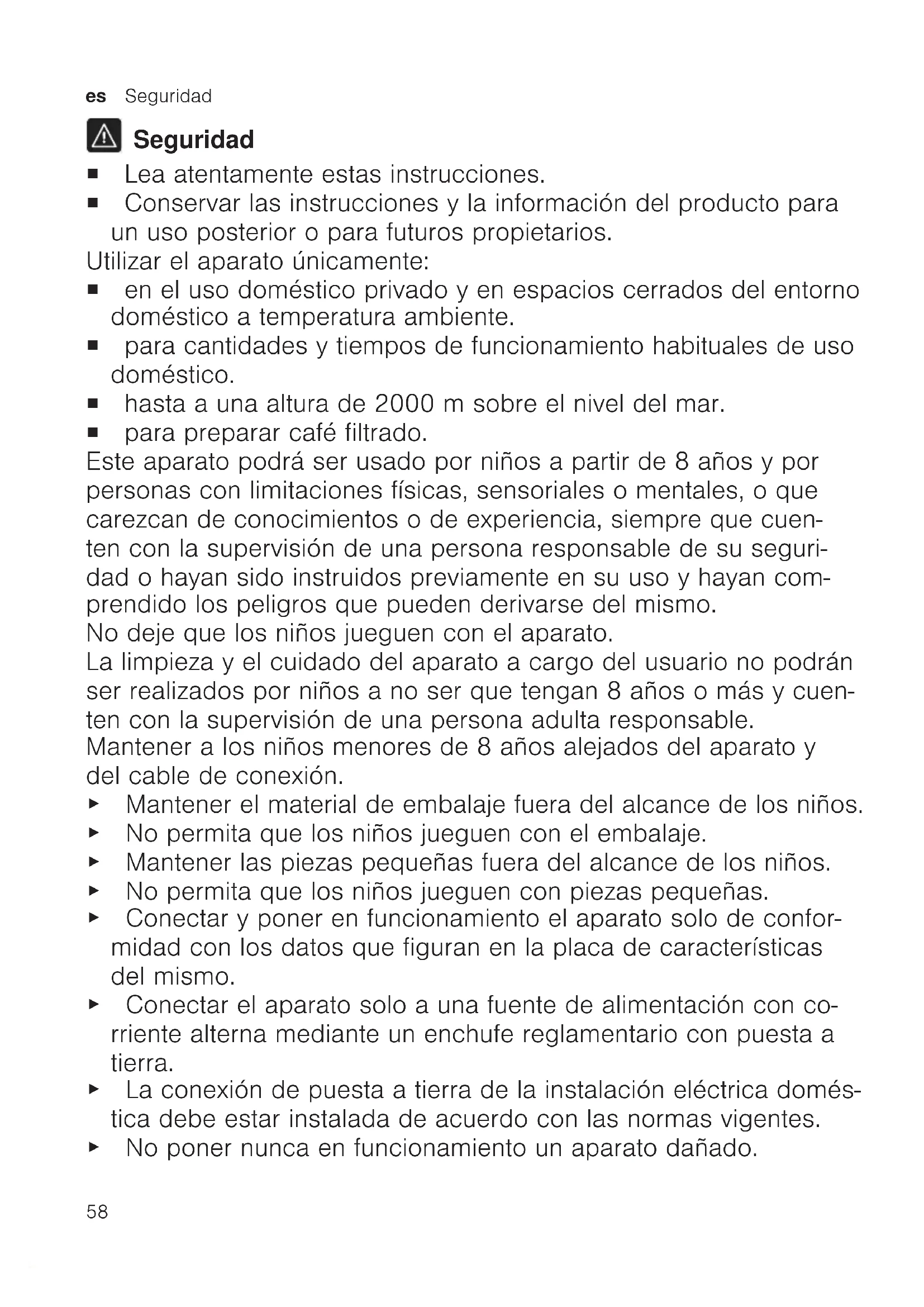 Seguridad ¡ Lea atentamente estas instrucciones. ¡ Conservar las instrucciones y la información del producto para un uso posterior o para futuros propietarios. Utilizar el aparato únicamente: ¡ en el uso doméstico privado y en espacios cerrados del entorno doméstico a temperatura ambiente. ¡ para cantidades y tiempos de funcionamiento habituales de uso doméstico. ¡ hasta a una altura de 2000msobre el nivel del mar. ¡ para preparar café filtrado. Este aparato podrá ser usado por niños a partir de 8 años y por personas con limitaciones físicas, sensoriales o mentales, o que carezcan de conocimientos o de experiencia, siempre que cuen- ten con la supervisión de una persona responsable de su seguri- dad o hayan sido instruidos previamente en su uso y hayan com- prendido los peligros que pueden derivarse del mismo. No deje que los niños jueguen con el aparato. La limpieza y el cuidado del aparato a cargo del usuario no podrán ser realizados por niños a no ser que tengan 8 años o más y cuen- ten con la supervisión de una persona adulta responsable. Mantener a los niños menores de 8 años alejados del aparato y del cable de conexión. ▶ Mantener el material de embalaje fuera del alcance de los niños. ▶ No permita que los niños jueguen con el embalaje. ▶ Mantener las piezas pequeñas fuera del alcance de los niños. ▶ No permita que los niños jueguen con piezas pequeñas. ▶ Conectar y poner en funcionamiento el aparato solo de confor- midad con los datos que figuran en la placa de características del mismo. ▶ Conectar el aparato solo a una fuente de alimentación con co- rriente alterna mediante un enchufe reglamentario con puesta a tierra. ▶ La conexión de puesta a tierra de la instalación eléctrica domés- tica debe estar instalada de acuerdo con las normas vigentes. ▶ No poner nunca en funcionamiento un aparato dañado.Seguridad es
