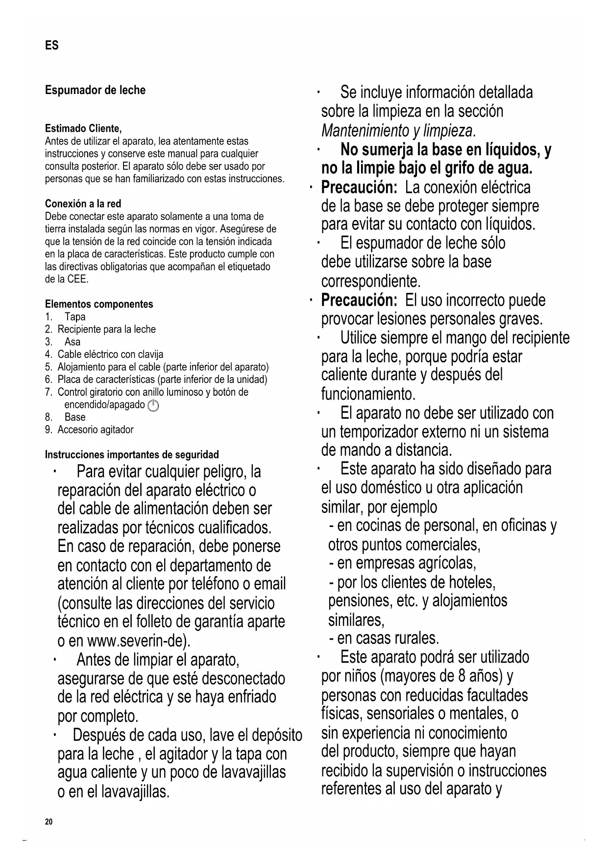 Instrucciones importantes de seguridad ∙ Para evitar cualquier peligro, la reparación del aparato eléctrico o del cable de alimentación deben ser realizadas por técnicos cualicados. En caso de reparación, debe ponerse en contacto con el departamento de atención al cliente por teléfono o email (consulte las direcciones del servicio técnico en el folleto de garantía aparte o en www.severin-de). ∙ Antes de limpiar el aparato, asegurarse de que esté desconectado de la red eléctrica y se haya enfriado por completo. ∙ Después de cada uso, lave el depósito para la leche , el agitador y la tapa con agua caliente y un poco de lavavajillas o en el lavavajillas. ∙ Se incluye información detallada sobre la limpieza en la sección Mantenimiento y limpieza. ∙ No sumerja la base en líquidos, y no la limpie bajo el grifo de agua. ∙ Precaución: La conexión eléctrica de la base se debe proteger siempre para evitar su contacto con líquidos. ∙ El espumador de leche sólo debe utilizarse sobre la base correspondiente. ∙ Precaución: El uso incorrecto puede provocar lesiones personales graves. ∙ Utilice siempre el mango del recipiente para la leche, porque podría estar caliente durante y después del funcionamiento. ∙ El aparato no debe ser utilizado con un temporizador externo ni un sistema de mando a distancia. ∙ Este aparato ha sido diseñado para el uso doméstico u otra aplicación similar, por ejemplo - en cocinas de personal, en ocinas y otros puntos comerciales, - en empresas agrícolas, - por los clientes de hoteles, pensiones, etc. y alojamientos similares, - en casas rurales. ∙ Este aparato podrá ser utilizado por niños (mayores de 8 años) y personas con reducidas facultades físicas, sensoriales o mentales, o sin experiencia ni conocimiento del producto, siempre que hayan recibido la supervisión o instrucciones referentes al uso del aparato y ES21 142 x 208 mm entiendan por completo el peligro y las precauciones de seguridad. ∙ Los niños no deben jugar con el aparato. ∙ No se debe permitir que los niños realicen ningún trabajo de limpieza o mantenimiento del aparato a menos que estén bajo vigilancia y tengan más de 8 años. ∙ El aparato y su cable eléctrico siempre se deben mantener fuera del alcance de niños menores de 8 años. ∙ Precaución: Mantenga a los niños alejados del material de embalaje, porque podría ser peligroso, existe el peligro de asxia. ∙ Antes de utilizar el aparato, siempre se debe comprobar que tanto la unidad principal, el cable de alimentación como cualquier accesorio no están defectuosos. En caso de que el aparato haya caído sobre una supercie dura, o se haya tirado en exceso del cable de alimentación, no se deberá utilizar de nuevo: incluso los desperfectos no visibles pueden tener efectos adversos sobre la seguridad en el uso del aparato. ∙ No deje el espumador de leche funcionando sin supervisión. ∙ Respete siempre las señales de nivel mín y máx del interior del recipiente en cada utilización. ∙ El saliente de la parte inferior del recipiente (señal de nivel mín.) debe estar cubierto de leche. Si no existe suciente leche, el aparato se podría sobrecalentar. ∙ Precaución: Llenar excesivamente el recipiente puede ser peligroso porque la leche espumada podría rebosar. ∙ Precaución: La tapa siempre debe estar cerrada durante el funcionamiento del aparato. ∙ El aparato solo se debe utilizar con los accesorios originales suministrados por el fabricante. ∙ El aparato siempre se debe montar sobre una supercie plana y rme. ∙ No deje que la caja ni el cable entren en contacto con llamas ni con ninguna supercie caliente tales como platos muy calientes. ∙ No permita que el cable eléctrico cuelgue suelto; se debe mantener el cable sucientemente alejado de las partes calientes del aparato. ∙ Desenchufe siempre el aparato - si hay una avería, - después del uso, y - antes de limpiarlo. ∙ Cuando se desenchufa la clavija de la pared, nunca tirar del cable de alimentación. ∙ No toque el enchufe con las manos mojadas. ∙ No se acepta responsabilidad alguna si hay averías a consecuencia del uso incorrecto del aparato o si estas instrucciones no han sido observadas debidamente. Uso previsto ∙ El aparato está diseñado únicamente para calentar/ espumar leche, chocolate caliente y cacao. Cualquier otro uso se considera inadecuado y puede ocasionar lesiones graves y daños en el aparato. ∙ No lo utilice con ningún otro alimento líquido o sólido. Antes de usarlo por primera vez ∙ Retire todo el material de embalaje y los adhesivos promocionales, y compruebe que tiene todos los componentes. ¡No retire la placa de características! ∙ Antes de utilizar el aparato por vez primera, o tras largos períodos de no utilización, se debe limpiar meticulosamente como viene indicado en la sección Mantenimiento y limpieza. Alojamiento para el cable ∙ En la parte inferior del aparato se encuentra el alojamiento para el cable, donde puede enrollarse el cable que no sea necesario. Funcionamiento Tapa ∙ La tapa siempre debe estar cerrada durante el funcionamiento del aparato. ∙ La tapa solo debe retirarse para echar chocolate. Control giratorio Pueden seleccionarse las funciones siguientes: è chocolate/cacao caliente è más espuma de leche y más rme è espuma de leche cremosa è solo calentar è espumar en frío Anillo luminoso Rojo Se ha seleccionado una función con calor. Azul Se ha seleccionado una función sin calor. Luz ja En proceso de preparación. Parpadeo lento El aparato está esperando una selección o ha terminado la preparación. Parpadeo rápido Se ha producido un fallo (consulte «Ayuda en caso de problemas» al nal de estas instrucciones).22 142 x 208 mm Nivel de llenado ∙ MIN Cantidad mínima 75 ml – el saliente debe estar cubierto ∙ MAX Espumar Cantidad máxima de leche 150 ml (señal inferior de nivel máx) ∙ MAX Batir y calentar Cantidad máxima 300 