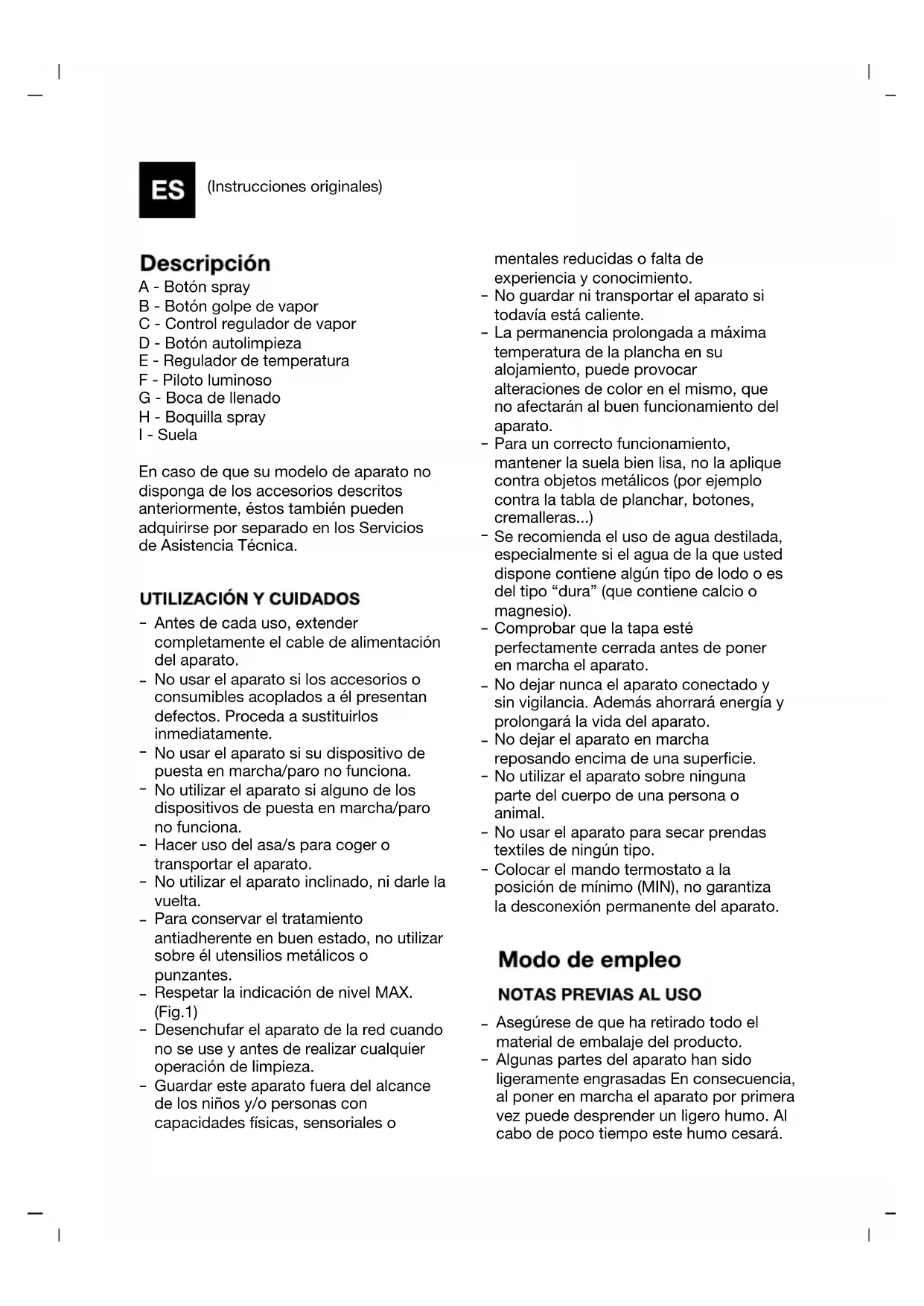 (Instrucciones originales) A - Botón spray B - Botón golpe de vapor C - Control regulador de vapor D - Botón autolimpieza E - Regulador de temperatura F - Piloto luminoso G - Boca de llenado H - Boquilla spray I - Suela En caso de que su modelo de aparato no disponga de los accesorios descritos anteriormente, éstos también pueden adquirirse por separado en los Servicios de Asistencia Técnica.