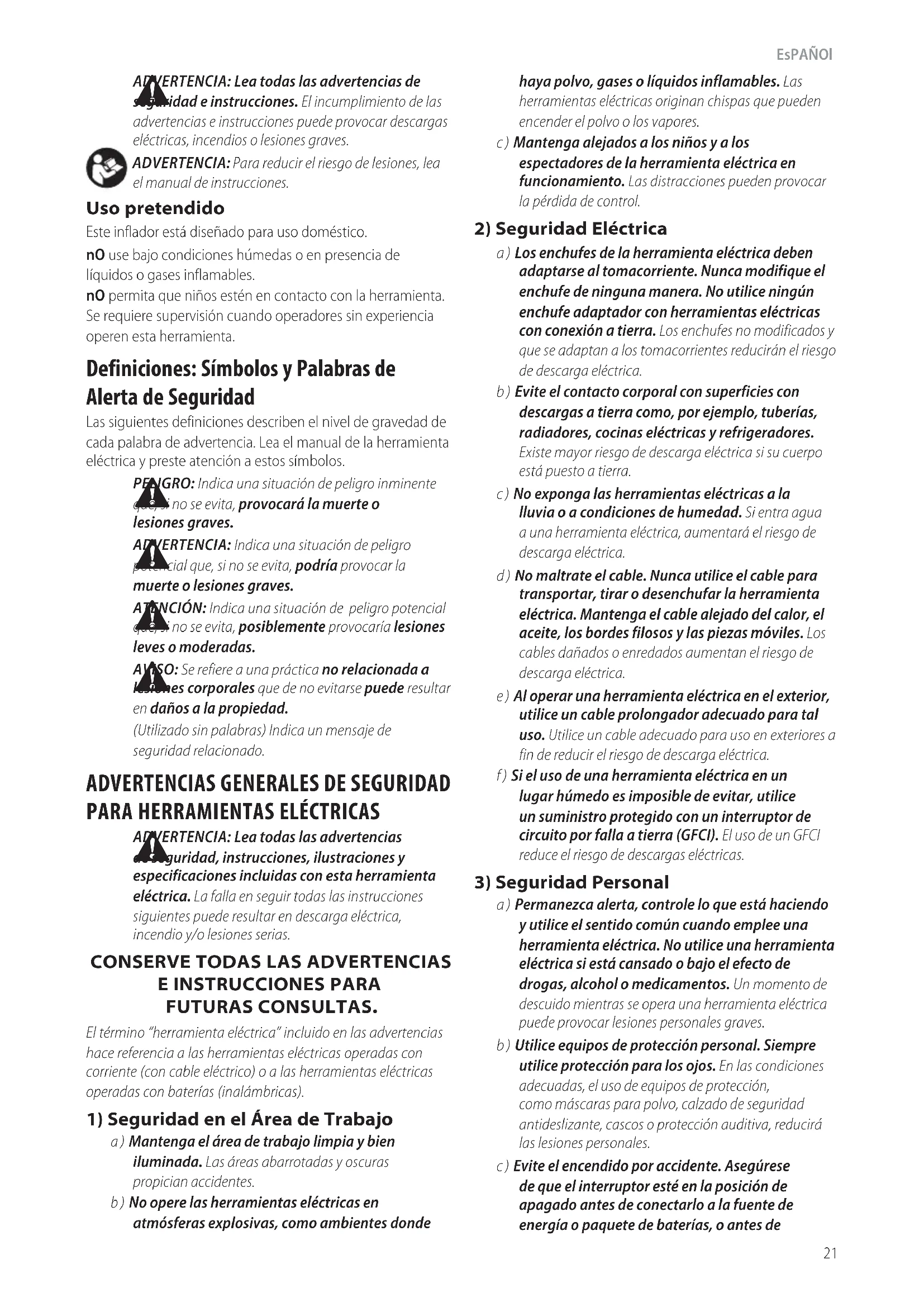 AVISO: Se refiere a una práctica no relacionada a lesiones corporales que de no evitarse puede resultar en daños a lapropiedad. (Utilizado sin palabras) Indica un mensaje de seguridadrelacionado. Uso pretendido Este inflador está diseñado para uso doméstico. nO use bajo condiciones húmedas o en presencia de líquidos o gases inflamables. nO permita que niños estén en contacto con la herramienta. Se requiere supervisión cuando operadores sin experiencia operen esta herramienta.EsPAñOl