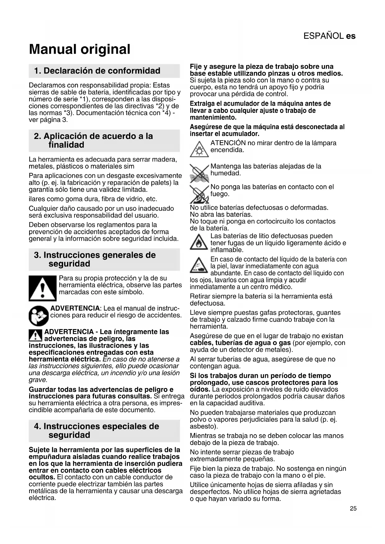 Manual original Declaramos con responsabilidad propia: Estas sierras de sable de batería, identificadas por tipo y número de serie *1), corresponden a las disposi- ciones correspondientes de las directivas *2) y de las normas *3). Documentación técnica con *4) - ver página 3. La herramienta es adecuada para serrar madera, metales, plásticos o materiales sim Para aplicaciones con un desgaste excesivamente alto (p. ej. la fabricación y reparación de palets) la garantía sólo tiene una validez limitada. ilares como goma dura, fibra de vidrio, etc. Cualquier daño causado por un uso inadecuado será exclusiva responsabilidad del usuario. Deben observarse los reglamentos para la prevención de accidentes aceptados de forma general y la información sobre seguridad incluida. Para su propia protección y la de su herramienta eléctrica, observe las partes marcadas con este símbolo. ADVERTENCIA: Lea el manual de instruc- ciones para reducir el riesgo de accidentes. ADVERTENCIA - Lea íntegramente las advertencias de peligro, las instrucciones, las ilustraciones y las especificaciones entregadas con esta herramienta eléctrica. En caso de no atenerse a las instrucciones siguientes, ello puede ocasionar una descarga eléctrica, un incendio y/o una lesión grave. Guardar todas las advertencias de peligro e instrucciones para futuras consultas. Si entrega su herramienta eléctrica a otra persona, es impres- cindible acompañarla de este documento. Sujete la herramienta por las superficies de la empuñadura aisladas cuando realice trabajos en los que la herramienta de inserción pudiera entrar en contacto con cables eléctricos ocultos. El contacto con un cable conductor de corriente puede electrizar también las partes metálicas de la herramienta y causar una descarga eléctrica. Fije y asegure la pieza de trabajo sobre una base estable utilizando pinzas u otros medios. Si sujeta la pieza solo con la mano o contra su cuerpo, esta no tendrá un apoyo fijo y podría provocar una pérdida de control. Extraiga el acumulador de la máquina antes de llevar a cabo cualquier ajuste o trabajo de mantenimiento. Asegúrese de que la máquina está desconectada al insertar el acumulador. ATENCIÓN no mirar dentro de la lámpara encendida. Mantenga las baterías alejadas de la humedad. No ponga las baterías en contacto con el fuego. No utilice baterías defectuosas o deformadas. No abra las baterías. No toque ni ponga en cortocircuito los contactos de la batería. Las baterías de litio defectuosas pueden tener fugas de un líquido ligeramente ácido e inflamable. En caso de contacto del líquido de la batería con la piel, lavar inmediatamente con agua abundante. En caso de contacto del líquido con los ojos, lavarlos con agua limpia y acudir inmediatamente a un centro médico. Retirar siempre la batería si la herramienta está defectuosa. Lleve siempre puestas gafas protectoras, guantes de trabajo y calzado firme cuando trabaje con la herramienta. Asegúrese de que en el lugar de trabajo no existan cables, tuberías de agua o gas (por ejemplo, con ayuda de un detector de metales). Al serrar tuberías de agua, asegúrese de que no contengan agua. Si los trabajos duran un período de tiempo prolongado, use cascos protectores para los oídos. La exposición a niveles de ruido elevados durante períodos prolongados podría causar daños en la capacidad auditiva. No pueden trabajarse materiales que produzcan polvo o vapores perjudiciales para la salud (p. ej. asbesto). Mientras se trabaja no se deben colocar las manos debajo de la pieza de trabajo. No intente serrar piezas de trabajo extremadamente pequeñas. Fije bien la pieza de trabajo. No sostenga en ningún caso la pieza de trabajo con la mano o el pie. Utilice únicamente hojas de sierra afiladas y sin desperfectos. No utilice hojas de sierra agrietadas o que hayan variado su forma.