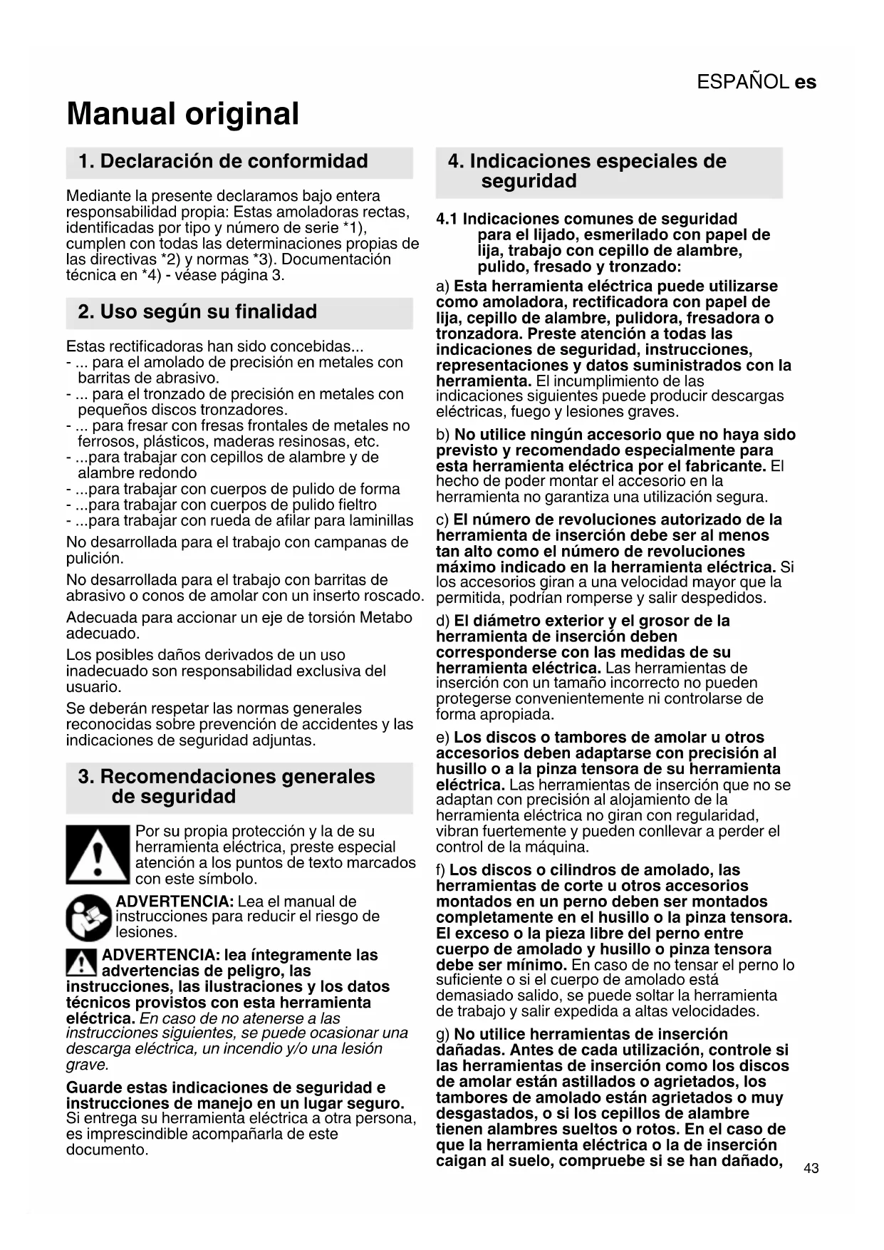 Manual original Mediante la presente declaramos bajo entera responsabilidad propia: Estas amoladoras rectas, identificadas por tipo y número de serie *1), cumplen con todas las determinaciones propias de las directivas *2) y normas *3). Documentación técnica en *4) - véase página 3. Estas rectificadoras han sido concebidas... - ... para el amolado de precisión en metales con barritas de abrasivo. - ... para el tronzado de precisión en metales con pequeños discos tronzadores. - ... para fresar con fresas frontales de metales no ferrosos, plásticos, maderas resinosas, etc. - ...para trabajar con cepillos de alambre y de alambre redondo - ...para trabajar con cuerpos de pulido de forma - ...para trabajar con cuerpos de pulido fieltro - ...para trabajar con rueda de afilar para laminillas No desarrollada para el trabajo con campanas de pulición. No desarrollada para el trabajo con barritas de abrasivo o conos de amolar con un inserto roscado. Adecuada para accionar un eje de torsión Metabo adecuado. Los posibles daños derivados de un uso inadecuado son responsabilidad exclusiva del usuario. Se deberán respetar las normas generales reconocidas sobre prevención de accidentes y las indicaciones de seguridad adjuntas. Por su propia protección y la de su herramienta eléctrica, preste especial atención a los puntos de texto marcados con este símbolo. ADVERTENCIA: Lea el manual de instrucciones para reducir el riesgo de lesiones. ADVERTENCIA: lea íntegramente las advertencias de peligro, las instrucciones, las ilustraciones y los datos técnicos provistos con esta herramienta eléctrica. En caso de no atenerse a las instrucciones siguientes, se puede ocasionar una descarga eléctrica, un incendio y/o una lesión grave. Guarde estas indicaciones de seguridad e instrucciones de manejo en un lugar seguro. Si entrega su herramienta eléctrica a otra persona, es imprescindible acompañarla de este documento.